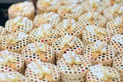 นอกจากนั้น ของชำร่วย ที่คุณแอ๊นท์และทางเวดดิ้ง แพลนเนอร์ เลือก ยังเก๋ไก๋แถมแฝงด้วยความหมายที่ดี นั่นก็คือขนมไทยมงคล 9 ชนิด ขนาดพอดีคำ บรรจุลงในภาชนะไม้ไผ่สานพร้อมส้อมไม้จิ๋วพร้อมทาน คิ้วท์สุดๆ