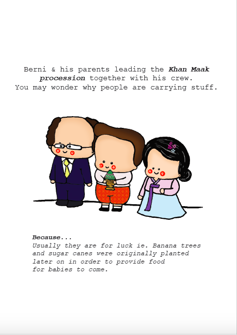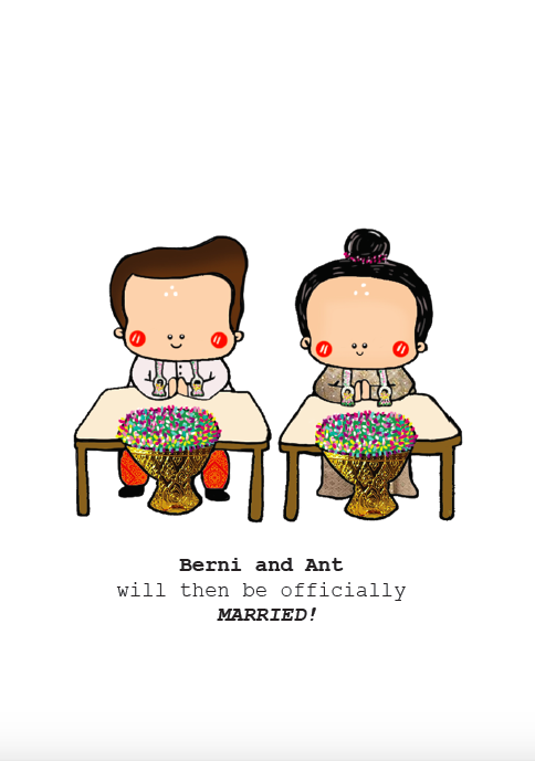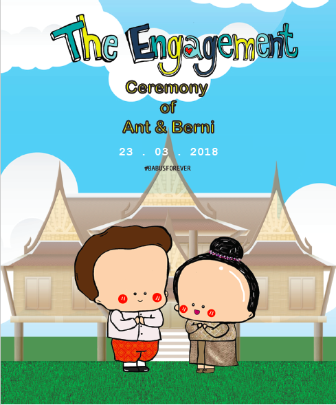 ที่ต้องยกนิ้วให้ยิ่งกว่านั้นคือ ตัวการ์ตูนที่ปรากฏอยู่ในภาพเป็นฝีมือของเจ้าสาว คุณแอ๊นท์ ทั้งหมด! เพราะว่าคุณแอ๊นท์เองเป็นคนที่ชอบวาดภาพอยู่แล้ว และเธอก็มีผลงานสติกเกอร์ใน LINE ที่เป็นคาแรคเตอร์ของตัวเธอเองนามว่า “น้องเหม่ง” (Nong Meng) ด้วย! (น่ารักแบบนี้ต้องรีบไปโหลดมาใช้แล้วละ) คุณแอ๊นท์แอบกระซิบว่า หากเจ้าสาวรุ่นน้องคนไหนสนใจไอเดียสูติบัตรงานแต่งงานพิธีไทยที่เธอทำอยู่ละก็ Direct Massage ไปหาคุณแอ๊นท์ที่ instagram : @ant.pk ได้นะ คุณแอ๊นท์ยินดีให้คำปรึกษาค่า