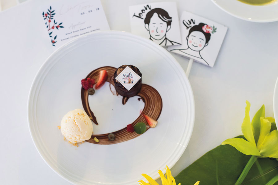และเพื่อให้แขกที่มาร่วมงานประทับใจ มีความสุขกับงาน ทั้งคู่ลงมือทำทุกดีเทล ตั้งแต่การ์ดเชิญ แผนที่งาน กระจก เซ็นคำอวยพร ป้ายชื่อแขกทุกคนบนโต๊ะอาหาร ของชำร่วย ป้ายขอบคุณ รวมทั้งออกแบบการวางโต๊ะ การจัดวางดอกไม้ แบ็กดร็อปถ่ายภาพ และกิจกรรมเพื่อให้แขกร่วมสนุกกันภายในงาน เรียกว่าใส่ใจทุกอย่างเพื่อให้งานแสดงออกถึงตัวตนของทั้งคู่จริงๆ