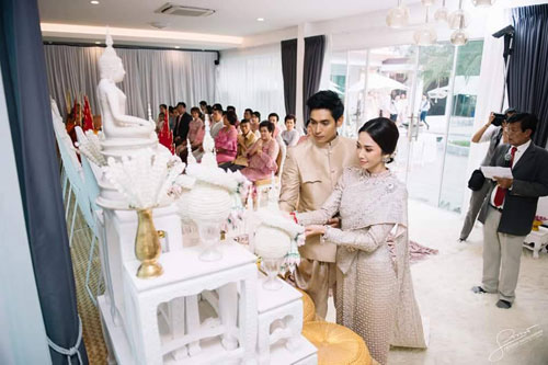 ทางด้านเจ้าบ่าวก็หล่อแบบชายไทยในสูทแบบทักซิโดพร้อมสวมกั๊กด้านในให้ดูภูมิฐาน แล้วนุ่งทับโจงกระเบนสำเร็จ