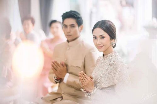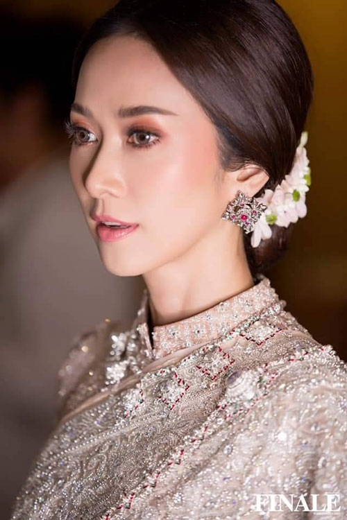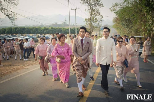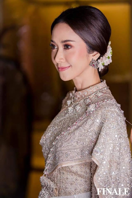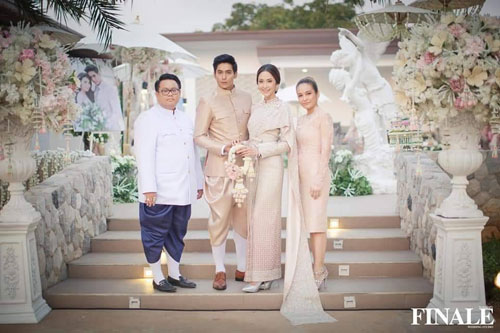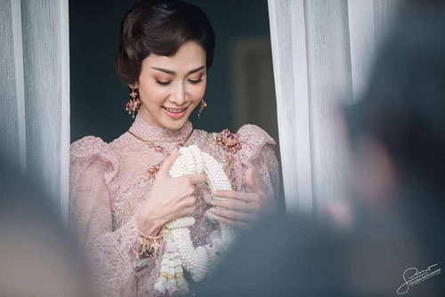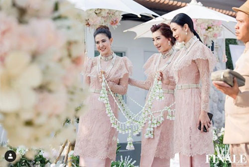 เริ่มต้นกันที่แก๊งเพื่อนเจ้าสาวกับชุดไทยแบบประยุกต์ในสมัยรัชกาลที่ 6 ตัวเสื้อเป็นแบบคอตั้งแขนยาวตัดเย็บจากผ้าลูกไม้ฝรั่งเศสในสีชมพูพีช เพิ่มความอ่อนหวานด้วยระบายเชิงลูกไม้จับเป็นวีบริเวณช่วงอก พร้อมเทคนิคการวางลูกไม้อย่างประณีตทั่วทั้งชุด ส่วนโครงชุดด้านในเป็นชุดเดรสเกาะอกทรงสอบตัดเย็บจากผ้าไหมไทยสีชมพู แล้วสวมใส่คู่กับเครื่องประดับมุก อย่าง โชกเกอร์มุก ต่างหูมุก และสายเข็มขัดมุก