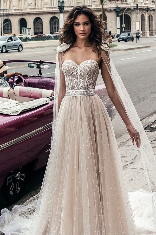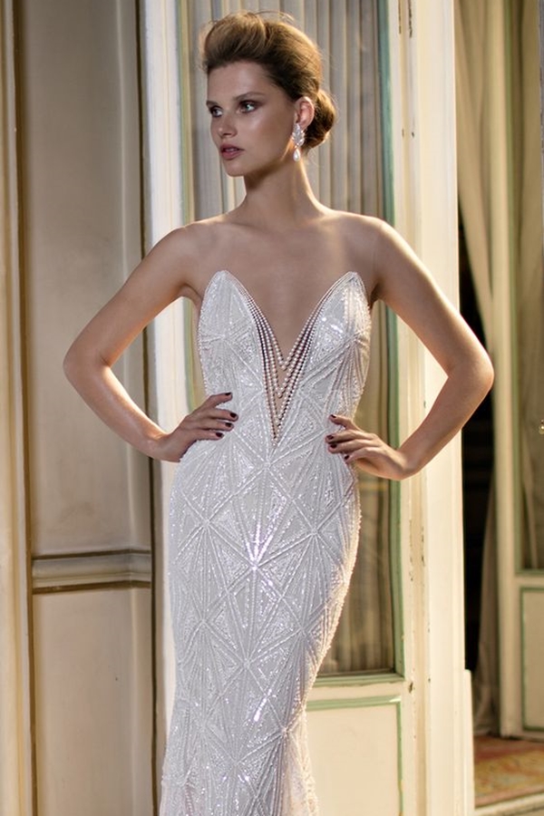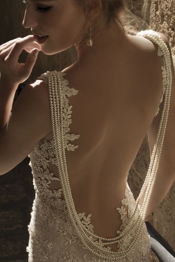 ชุดแต่งงานที่ประดับไข่มุก ต่อให้ดูจากที่ไกลๆ ก็เห็นความอ่อนหวานและพริ้วไหวไปกับเกลียวคลื่น ดุจดั่ง Lady of the Sea เลยทีเดียว เป็นชุดแต่งงานในเทพนิยายที่สาวคนไหนใส่ก็ดูอ่อนโยน แถมยังเลอค่าตามราคาไข่มุกไปอี๊ก