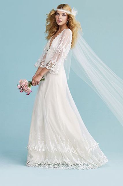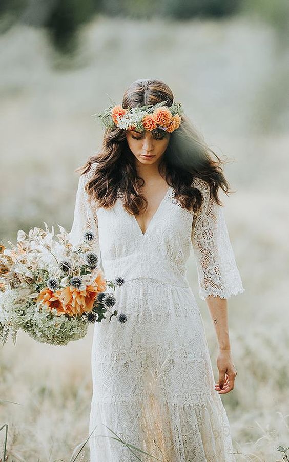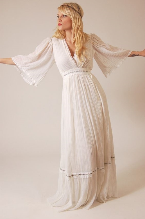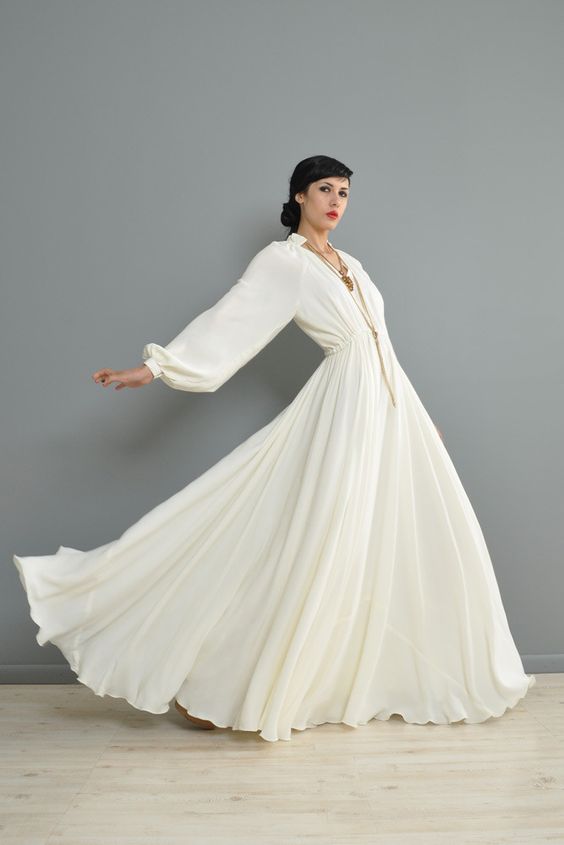 ชุดในยุค 70 เป็นชุดแต่งงานที่เรามักเรียกกันว่า ชุดโบฮีเมียม มีความปล่อยตรงบานออกน้อยๆ แบบทรงเอ แขนยาวทรงกระดิ่ง เป็นยุคทองของผ้าลูกไม้ ผ้าฉลุลาย ความพลิ้ว ความสบายมีเท่าไหร่ใส่ไปอย่ารอช้า ในขณะที่คอชุดเป็นทรงสี่เหลี่ยมจะอินสุดๆ ส่วนเครื่องหัวก็ต้องเต็มไปด้วยมงกุฎดอกไม้สีสันสดใส และเวลยาวๆ บางๆ ที่เอาไว้โชว์ความพลิ้วของชุด ในการแต่งหน้าก็จะเน้นความเป็นธรรมชาติ สีผิวแทนๆ สวยสุดๆ ส่วนผมก็ปล่อยยาวสบายๆ แต่ต้องมีความหยิกแบบเซอร์นิดๆ ถึงจะเรียกว่าได้ลุค 70