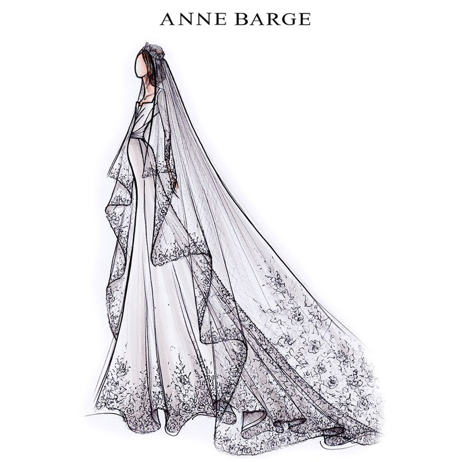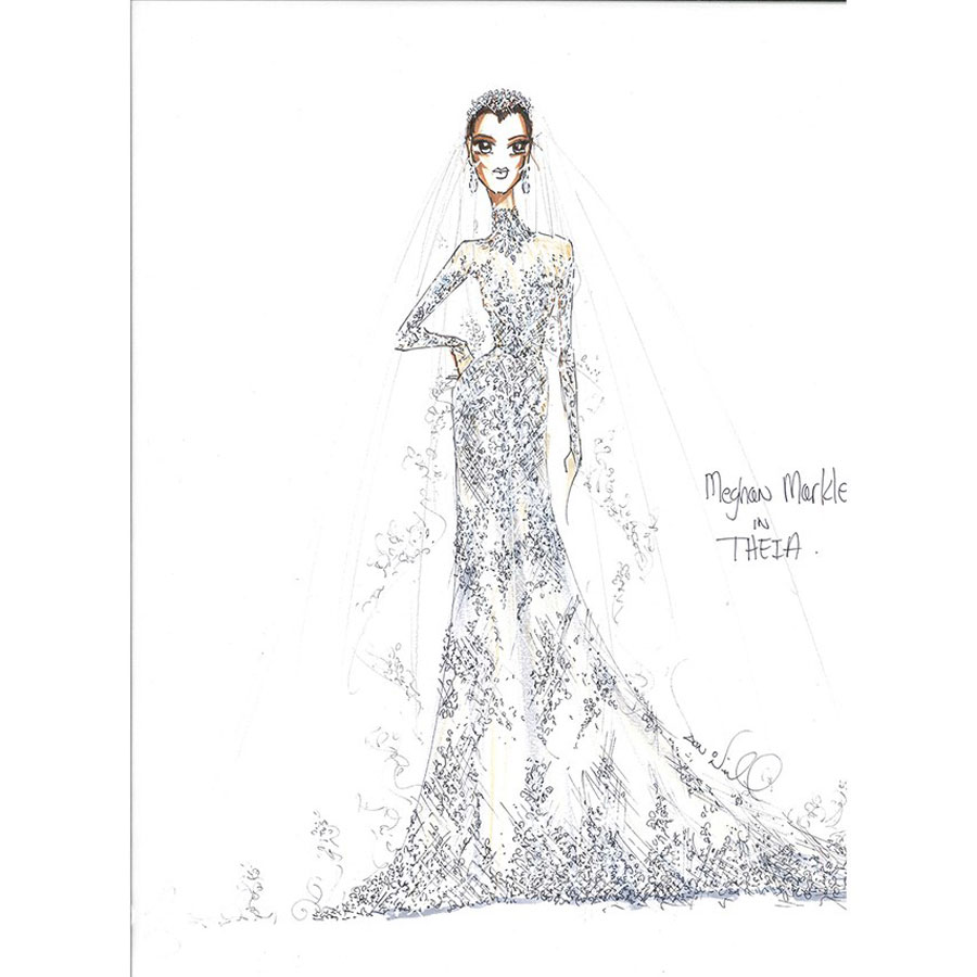 “ฉันคิดว่าเมแกนจะต้องใส่ชุดที่ดูคลาสสิค แต่จะต้องดูดีมีรสนิยมและมีสไตล์พร้อมจุดเด่นที่ทันสมัย ฉันจึงสเกตซ์ชุดแต่งงานที่ทำจากผ้าไหม ที่มีรูปทรงอันเลอเลิศและมีความเงาวาวนุ่มนวล ช่วงกระโปรงจะคอดเข้าเอวเพื่อเน้นทรวดทรงของเมแกน ส่วนเสื้อท่อนบนออกแบบเป็นคอกลม และเป็นเสื้อแขนยาวที่ทำจากผ้าลูกไม้ Chantilly ของฝรั่งเศส ด้านหลังออกแบบให้เป็นทรง V-back เพื่อช่วยขับสีผิวอันโดดเด่นของเธอ และฉันคิดว่าชุดแต่งงานชุดนี้จะต้องออกมาดูดีแน่นอน มันเป็นสิ่งที่เป็นไปตามวัฒนธรรมดั้งเดิม และครอบครัวที่เป็นราชวงศ์ของเธอก็น่าจะคาดหวังหรืออาจต้องการให้เป็นแบบนี้ แต่ขณะเดียวกันมันก็ยังแสดงออกถึงเซ้นต์ทางด้านสไตล์ของเธอ”