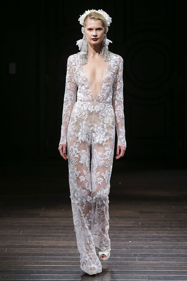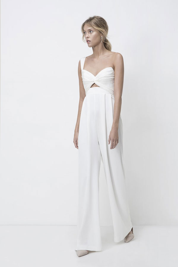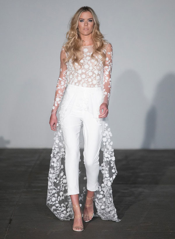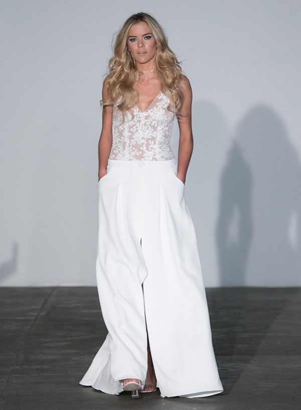 ใครว่าเจ้าสาวจะใส่ชุดแต่งงานที่เป็นกางเกงขายาวไม่ได้ (ล่าสุดคุณบุ้ง-สะธี ใบหยก เจ้าสาวสุดห้าวของคุณเวฟ-สาริน เพิ่งใส่โชว์ให้ดูเป็นตัวอย่าง) โดยสไตล์นี้ได้แรงบันดาลใจมาจากสไตล์ของ บิอันก้า แจ็กเกอร์ ไอคอนิคทางด้านแฟชั่นในยุค 70s แต่ถ้าคุณเลือกชุดแต่งงานที่ทันสมัยขนาดนี้ก็อย่าลืมเลือกสถานที่หรือธีมงานให้ดูทันสมัยเข้ากันด้วยนะคะ