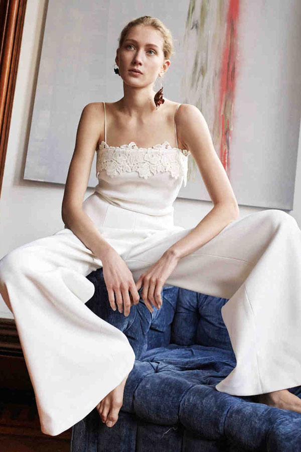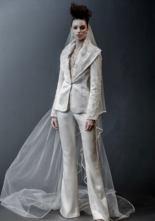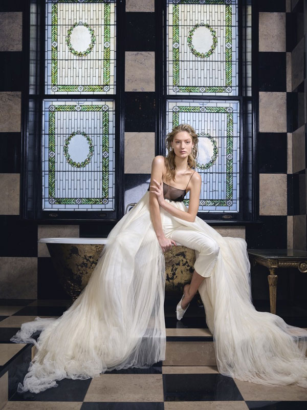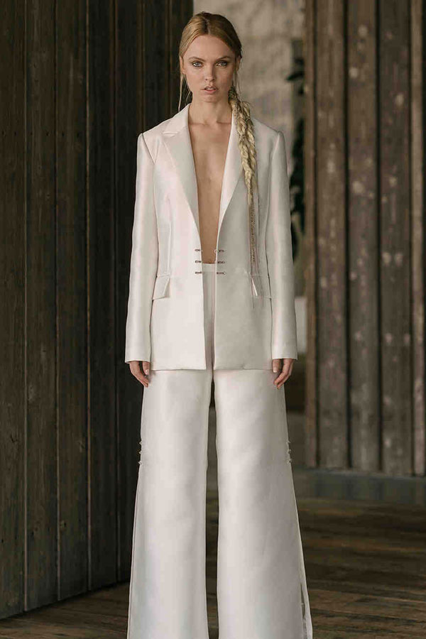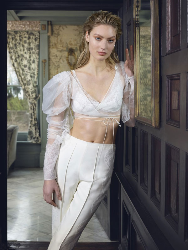 อีกหนึ่งชุดแต่งงานสุดเรียบง่าย ที่เหมาะกับงานแต่งงานแบบสบายๆ ไม่หวือหวา กับชุดแต่งงานแบบสองชิ้นด้านบนเป็นเสื้อคอกลม พร้อมกางเกงที่มีปลายขาที่บานออกนิดๆ ซื้อเสื้อผ้าทั้งสองชิ้นนั้นระยิบระยับด้วยดีเทลของกลิตเตอร์ ซึ่งว่าที่เจ้าสาวสามารถนำลุคนี้ไปปรับใช้สำหรับใครที่อยากจะเปลี่ยนลุค โดยอาจจะนำกระโปรงทรงสวยเตรียมไว้ใส่ช่วงรีเซปชั่นก็ได้ แล้วค่อยเปลี่ยนเป็นลุคกางเกงตามภาพในช่วงอาฟเตอร์ปาร์ตี้