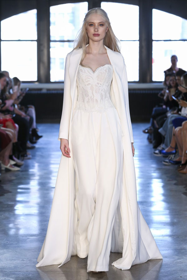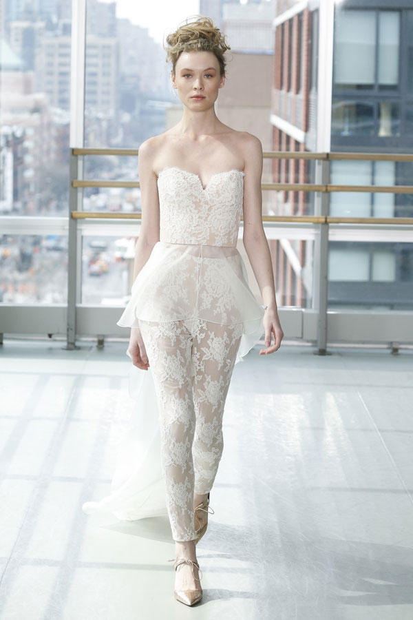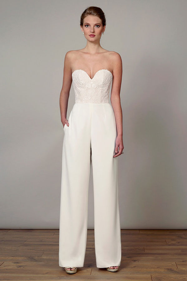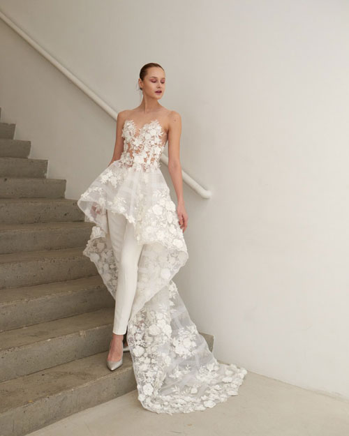 ชุดแต่งงานแบบจัมพ์สูท อีกหนึ่งลุคชุดแต่งงานสุดอินเทรนด์เหมาะกับว่าที่เจ้าสาวที่รักความแตกต่าง และอยากมีสไตล์ไม่ซ้ำใครเป็นของตัวเอง โดดเด่นด้วยดีเทลชุดที่มีซิลูเอทแบบวีลึก เสริมด้วยลูกไม้สวยหรูสไตล์ซีทรูสุดเย้ายวน มาพร้อมแขนเสื้อแบบโอเวอร์ไซส์ปลายเป็นแขนกระดิ่งนิดๆ ที่ช่วยปรับลุคให้ดูทันสมัยมากขึ้น