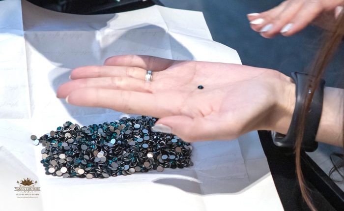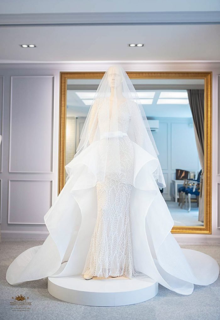 ในพิธีฉลองมงคลสมรสตอนเย็นเจ้าสาวโดดเด่นด้วยชุดเดรสสีขาวเข้ารูปคอวีแขนยาว เสริมความสง่าด้วยกระโปรงผ้าระบายที่ด้านหลัง งานปักคริสตัลทั้งชุด แถมยังปักคริสตับสวารอฟสกี้สีมรกต สวยมากแม่! และแน่นอนว่าชุดสวยๆ แบบนี้ก็มาจากแบรนด์ Vanus Couture อีกเช่นกัน