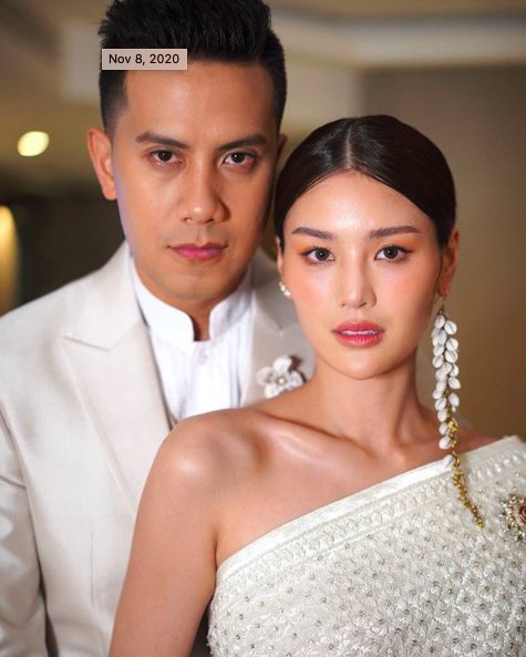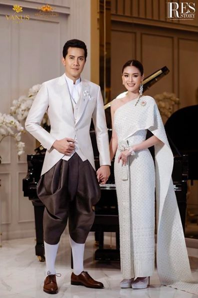 ส่วนชุดเจ้าบ่าวเจ้าสาวขอบอกเลยว่าปังมาก! เริ่มจากพิธีไทยที่ทั้งคู่สวมใส่ชุดผ้าไหมไทยสีขาว โดยเฉพาะชุดเจ้าสาวที่ปักคริสตัลสวยงามตลอดทั้งผืน จากแบรนด์ Vanus Couture