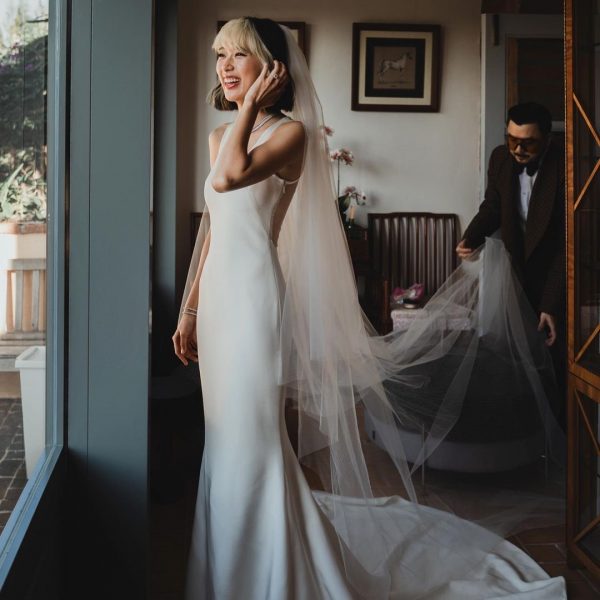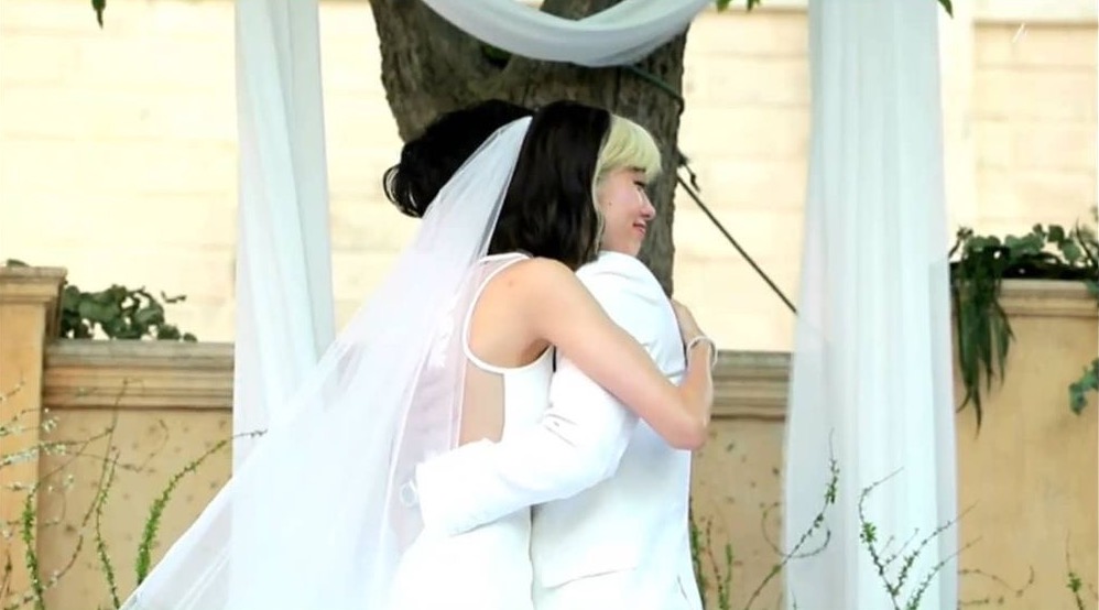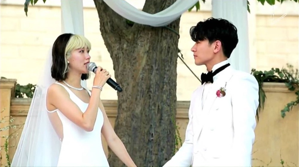 สำหรับพิธีแลกคำสัญญาเริ่มขึ้นเวลา 16:00 น. เพียงแค่เจ้าบ่าวได้เห็นเจ้าสาวเดินเข้ามาในพิธีก็ถึงกับน้ำตาซึมกันทั้งคู่ โดยเจ้าสาวมาในชุดเดรสยาวสวย เรียบง่าย แต่ดูหรูหรา ซ่อนความเซ็กซี่เล็กน้อยกับเนื้อผ้าซีทรูและลายลูกไม้ด้านหลัง ประดับเวลเพิ่มความสง่า จากฝีมือดีไซเนอร์ไทยระดับเทพ “คุณหมู อาซาว่า” แบรนด์ White Asava ที่เจ้าสาวเผยว่าชุดนี้ถือเป็นของขวัญวันแต่งงานจากคุณหมู แถมด้วยทรงผมสีทูโทนสุดเท่ บอกเลยว่าเจ้าสาวสวยสดใสในแบบของตัวเองมากๆ