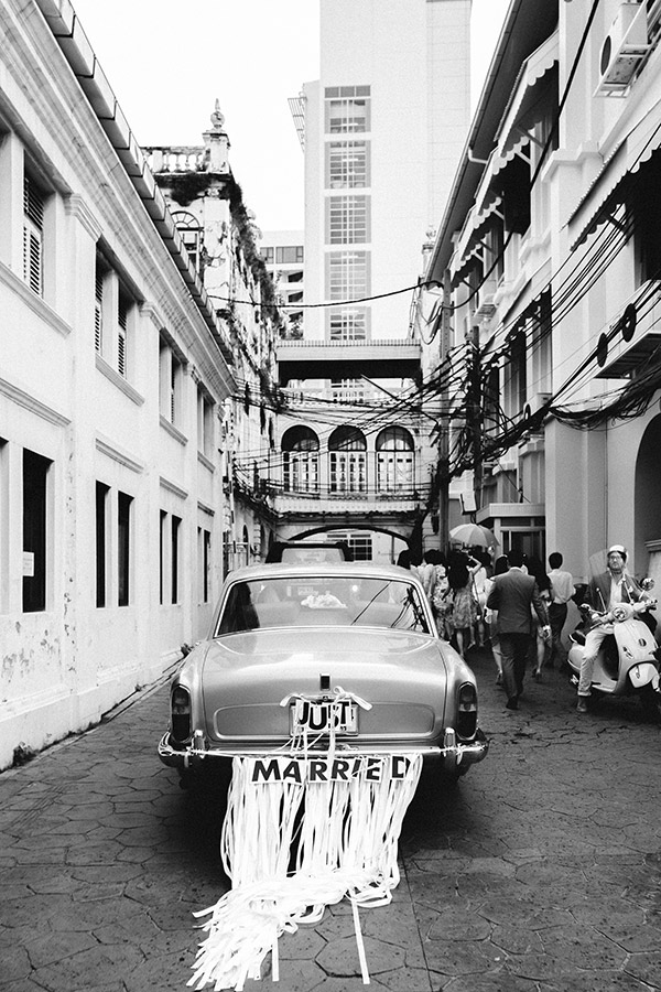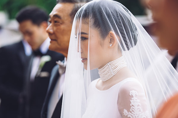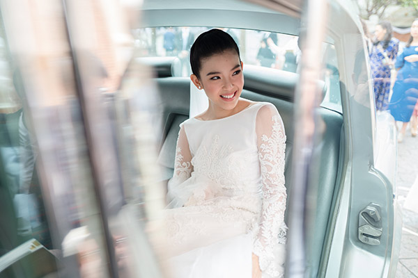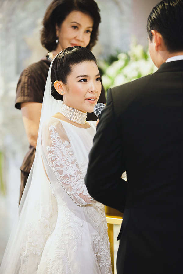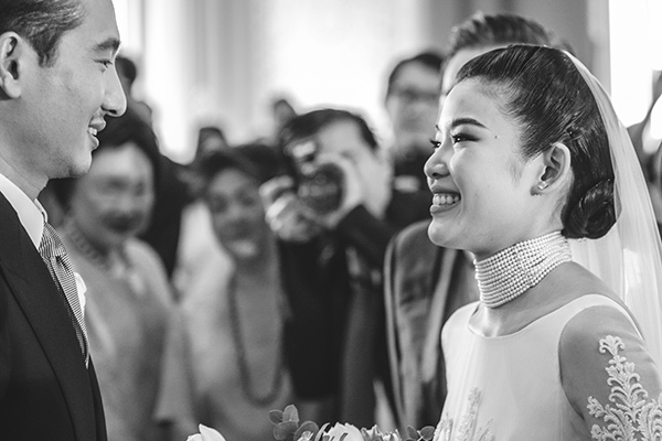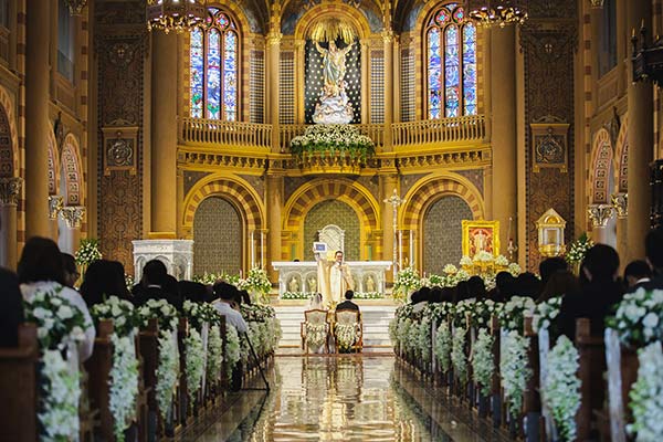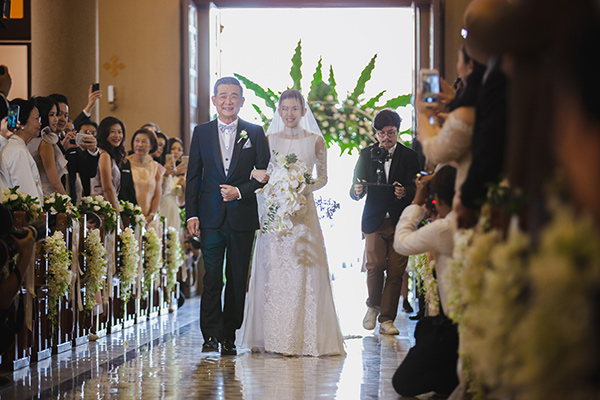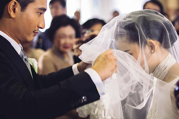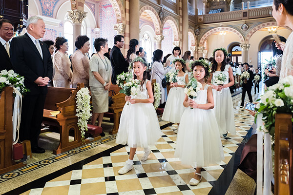 พิธีมงคลสมรสตามธรรมเนียมคริสต์ดำเนินไปท่ามกลางความงดงามของโบสถ์อัสสัมชัญ บางรัก ซึ่งเป็นสถาปัตยกรรมแบบเรเนซองส์ ภายในตกแต่งด้วยสีทองอร่ามตาและประดับภาพจิตรกรรมแบบเฟรสโกที่ชวนหลงใหล ความสวยงามหรูหราเป็นทุนเดิมของโบสถ์แห่งนี้ประกอบกับดอกไม้สีขาวที่แต่งแต้มตามจุดต่างๆ อย่างพอดิบพอดี ช่วยสร้างบรรยากาศแห่งความศักดิ์สิทธิ์และความโรแมนติกได้อย่างสมบูรณ์แบบ