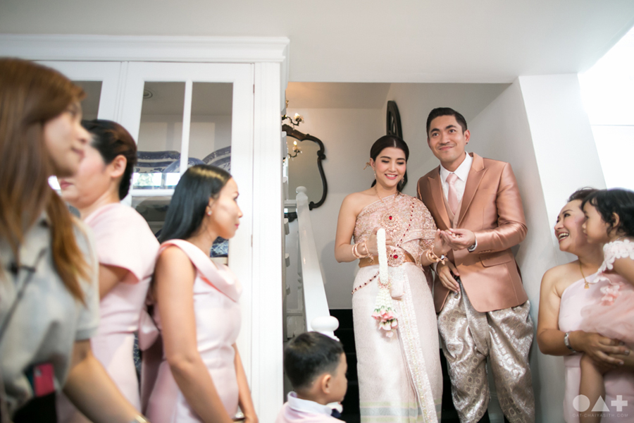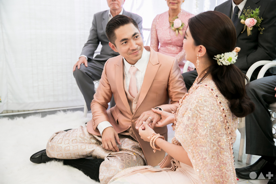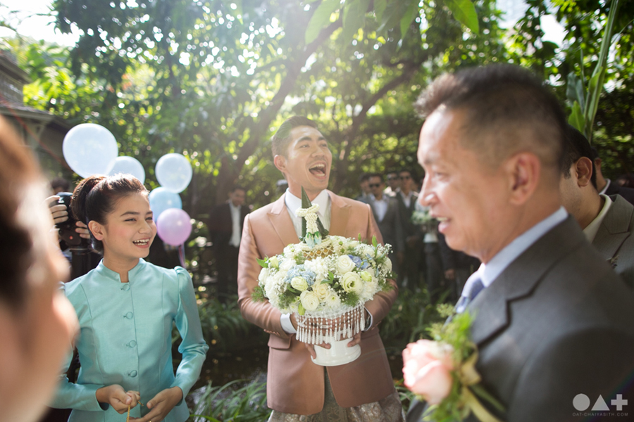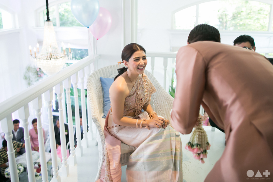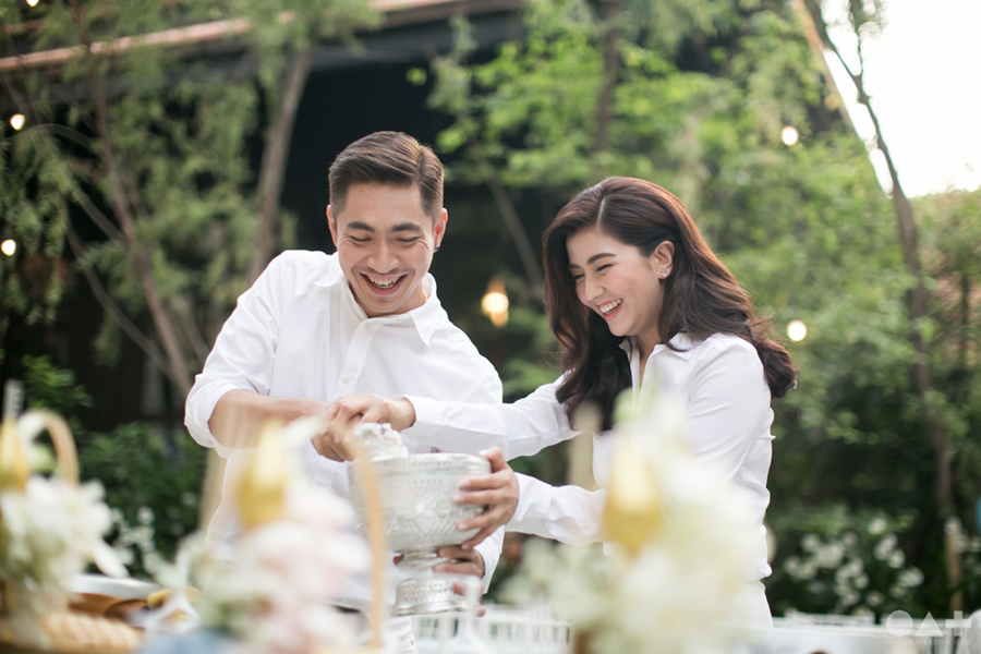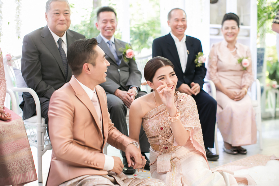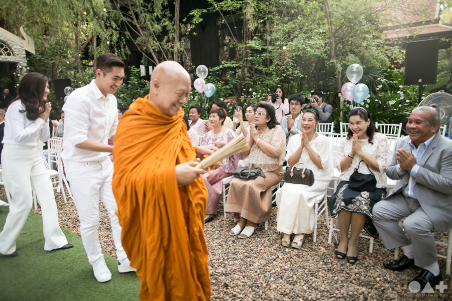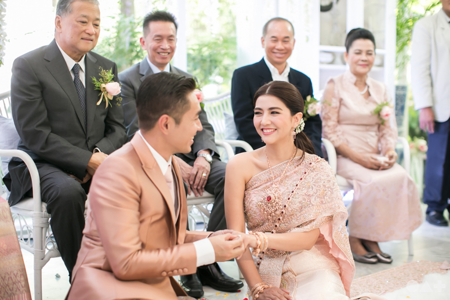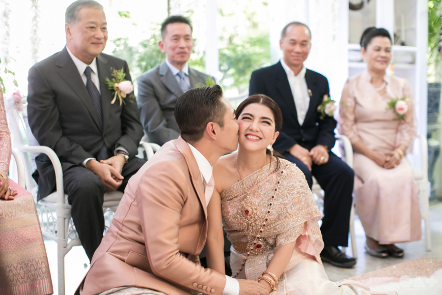 เริ่มต้นที่พิธีสงฆ์เรียบง่ายในชุดขาวคู่ ก่อนจะเปลี่ยนเป็นชุดไทยตามประเพณีจาก Finale Weddiin Studio โดยมีเพื่อนๆ และสมาชิกในครอบครัวมากันพร้อมหน้าสร้างบรรยากาศอบอุ่นกันทุกอณู แต่งานแต่งของคู่นี้ไม่ได้มีแค่อารมณ์เดียว เพราะครื้นเครงสุดๆ ด้วยแก๊งเพื่อนๆ ที่พร้อมใจกันมากั้นประตูเงินประตูทอง จนว่าที่เจ้าบ่าวปาดเหงื่อแล้วปาดเหงื่ออีก แต่สุดท้าย ว่าที่เจ้าบ่าวของเราก็ผ่านไปรับตัวเจ้าสาวได้ ท่ามกลางความหวานซึ้งไม่แพ้ใคร