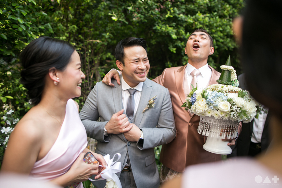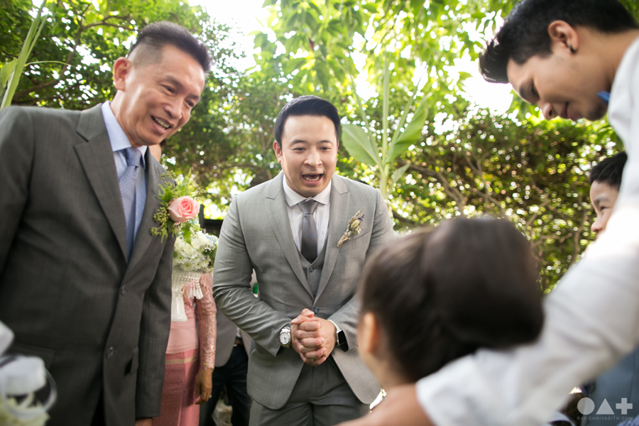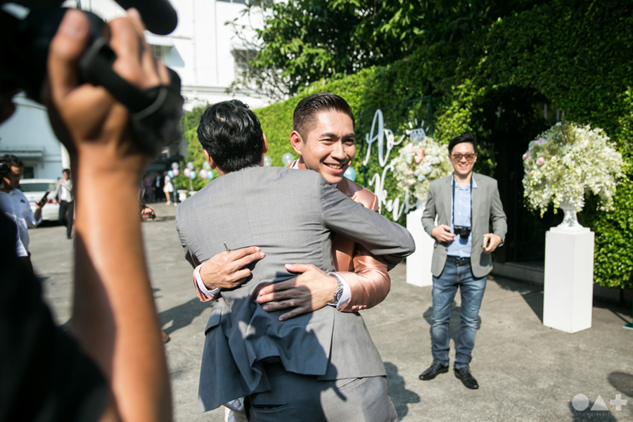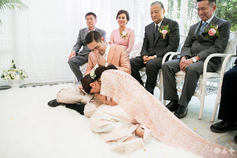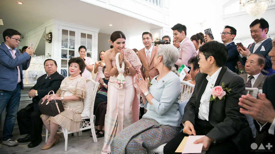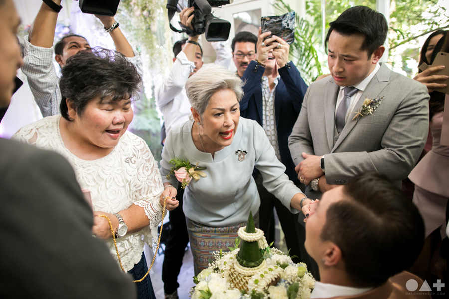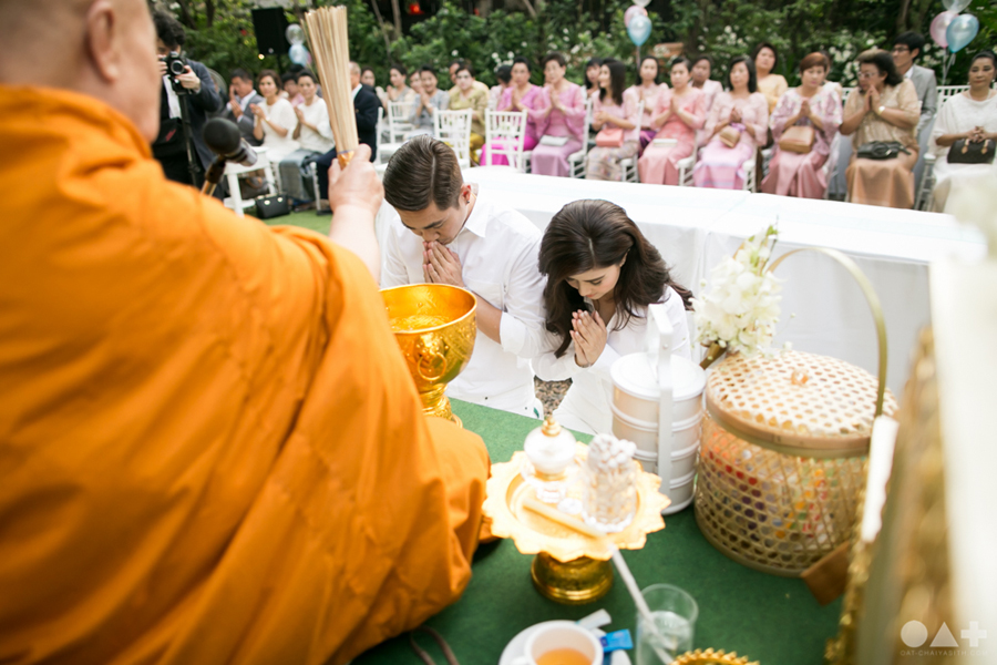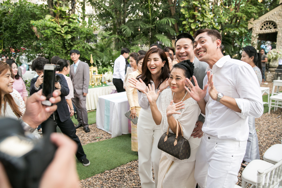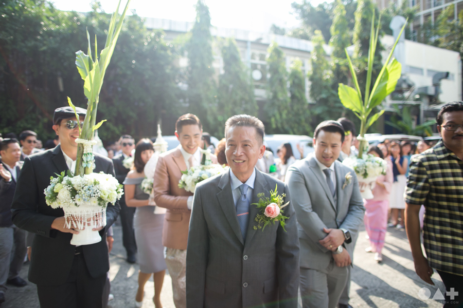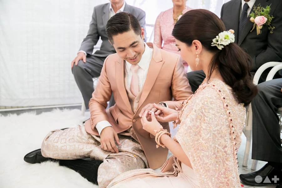 เริ่มต้นที่พิธีสงฆ์เรียบง่ายในชุดขาวคู่ ก่อนจะเปลี่ยนเป็นชุดไทยตามประเพณีจาก Finale Weddiin Studio โดยมีเพื่อนๆ และสมาชิกในครอบครัวมากันพร้อมหน้าสร้างบรรยากาศอบอุ่นกันทุกอณู แต่งานแต่งของคู่นี้ไม่ได้มีแค่อารมณ์เดียว เพราะครื้นเครงสุดๆ ด้วยแก๊งเพื่อนๆ ที่พร้อมใจกันมากั้นประตูเงินประตูทอง จนว่าที่เจ้าบ่าวปาดเหงื่อแล้วปาดเหงื่ออีก แต่สุดท้าย ว่าที่เจ้าบ่าวของเราก็ผ่านไปรับตัวเจ้าสาวได้ ท่ามกลางความหวานซึ้งไม่แพ้ใคร
