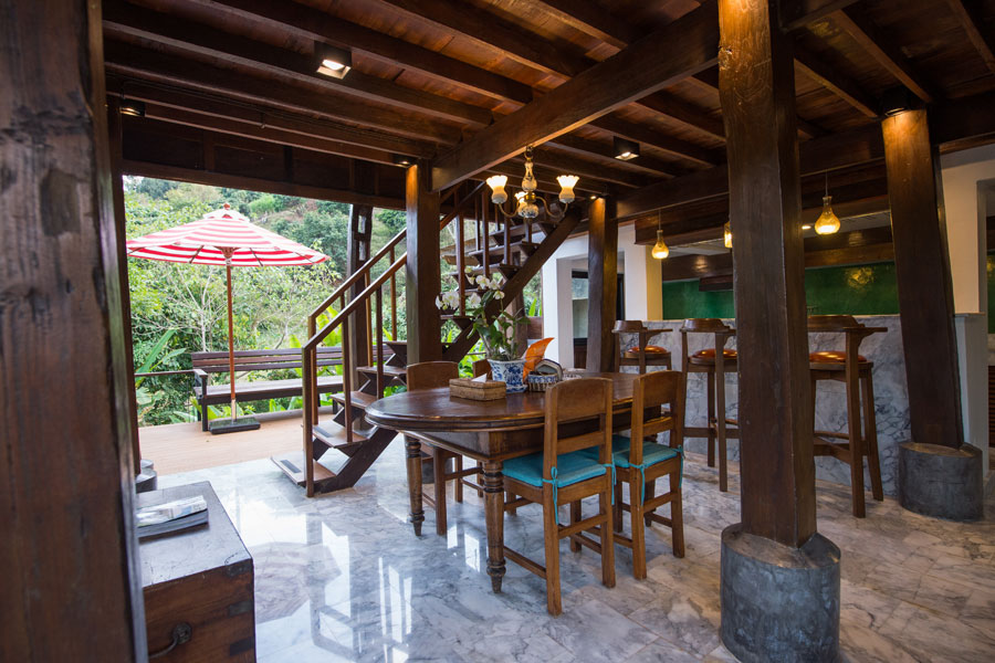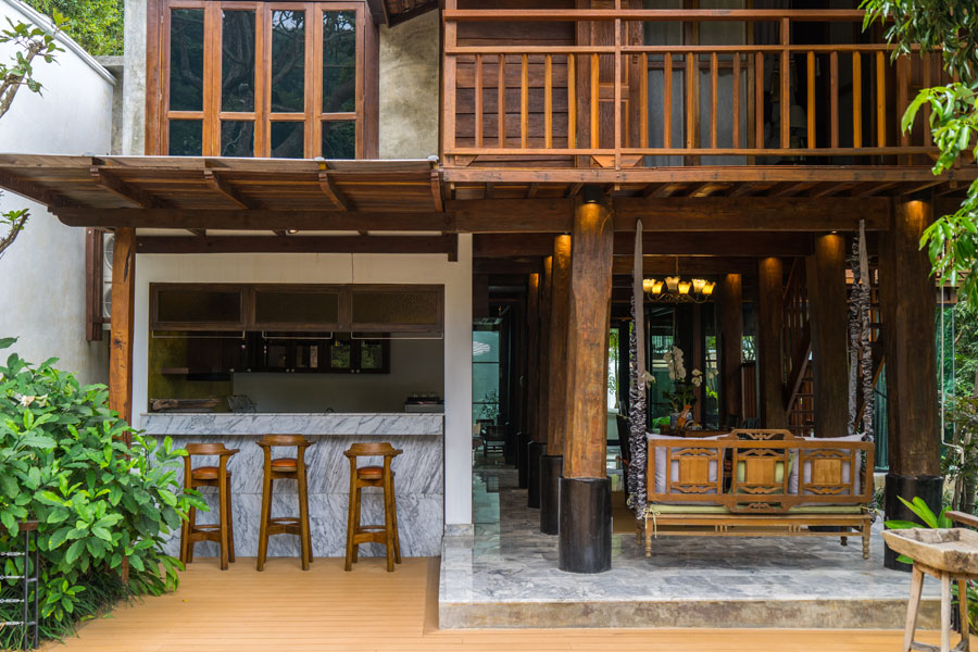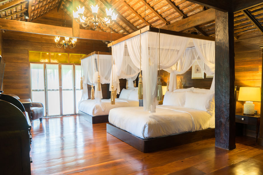 บ้านพักสไตล์หลองข้าว 2 ชั้น ขนาด 100 ตารางเมตร พร้อมห้องนั่งเล่น ห้องน้ำ และบาร์ที่ชั้นล่าง ชั้นบนโดดเด่นด้วยห้องนอนแบบเตียงเดี่ยวสไตล์มุ้ง 4 เสาเพดานสูง พร้อมระเบียงส่วนตัวเพื่อชมแมกไม้อันเขียวขจี