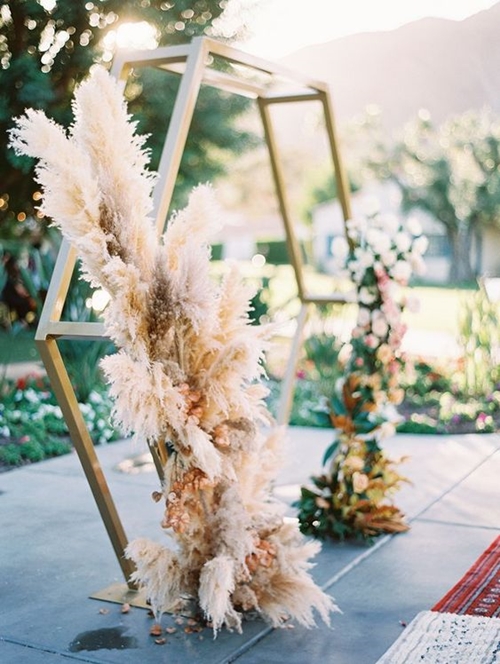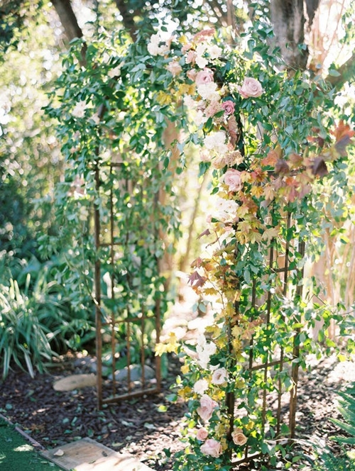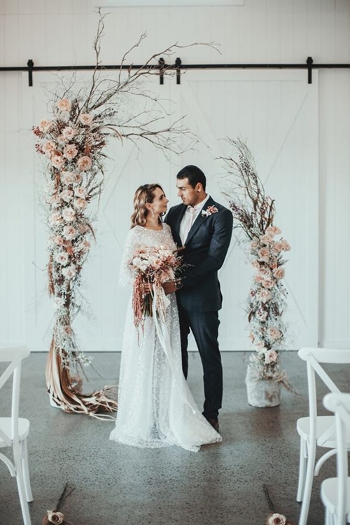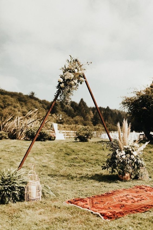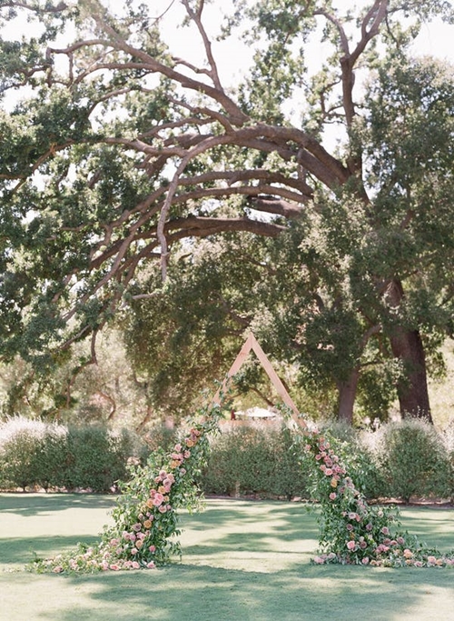 ดีไซน์แปลกใหม่ในปัจจุบันกับซุ้มประตูสามเหลี่ยมหน้าจั่ว เน้นโชว์ความเรียวของไม้ต่อประกบกันตามสไตล์มินิมอล เพิ่มเติมด้วยการประดับดอกไม้เพียงเล็กน้อย ก็ทำให้งานสวยชิคๆ ได้