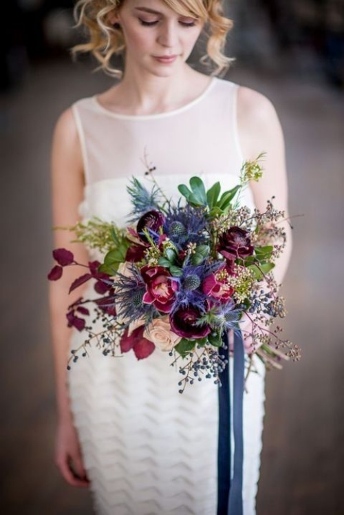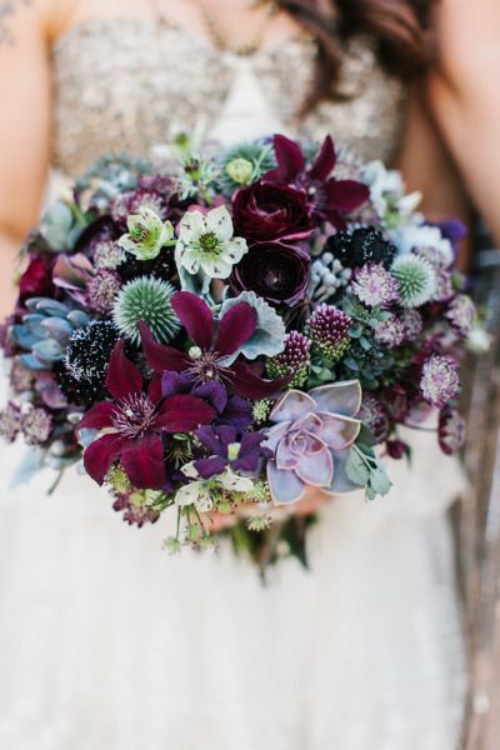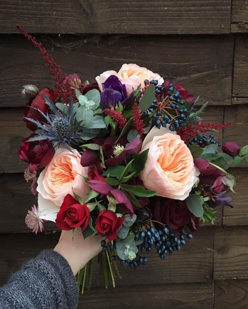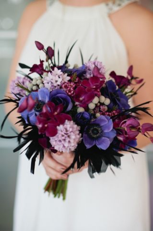 ความลึกลับ น่าค้นหา และเต็มไปด้วยเสน่ห์อันเย้ายวนจากสีม่วง จะช่วยหักเหความดาร์กจากสีเบอร์กันดีได้ อีกทั้งการประดับดอกไม้สีม่วงแซมเข้าไป ก็ทำให้ช่อดอกไม้ของคุณช่อนี้ดูพิเศษขึ้นไปอีก เป็นอีกหนึ่งไอเดียที่เราอยากแนะนำ