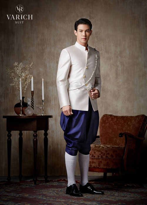 จะต่างกันในเรื่องสีที่เป็นมงคล รวมไปถึงลูกเล่นต่างๆ บนชุดเจ้าบ่าว และเรายังดูเทรนด์ต่างประเทศด้วยว่าปัจจุบันเจ้าบ่าวเขาใส่ชุดประมาณไหน รวมไปถึงรูปแบบการจัดงานด้วย เช่น หากเป็นงานกลางแจ้งหรืองานกลางวัน ชุดเจ้าบ่าวก็ควรเป็นเฉดสีที่นุ่มสบายตา ไม่ต้องมีพลังมาก ซึ่งทางร้านจะมีทีมงานคอยให้คำปรึกษา ส่วนชุดไทยเราก็ใส่ใจให้มีความกลมกลืนไปกับชุดของเจ้าสาว ไม่ว่าจะเรื่องรูปแบบชุดไปจนถึงกระดุมก็เลือกให้เข้ากัน เช่น หากเจ้าสาวใส่ชุดไทยที่มีเครื่องประดับสีทอง กระดุมชุดของเจ้าบ่าวก็ต้องเป็นสีทองด้วย ซึ่งโดยปกติแล้วเจ้าบ่าวอาจไม่มีสิทธิ์เลือกมากนัก รวมไปถึงชุดยกน้ำชาที่เป็นปัญหาของเจ้าบ่าวส่วนใหญ่ว่าจะใส่สีอะไรให้เข้ากับชุดสีแดงของเจ้าสาวดี โดยเราก็จะมีคู่สีที่ไปได้ดีกับชุดสีแดง เช่น สีเทา สีครีม หรือเฉดสีอ่อนอื่นๆ เพราะผู้ใหญ่อาจรู้สึกว่าสีเข้มดูไม่เป็นมงคล เลยทำให้ทางร้านมีคอลเล็กชั่นสำหรับชุดยกน้ำชาโดยเฉพาะ เช่น ดีไซน์ในรูปแบบคอจีนเพื่อให้ดูมีความทันสมัยมากขึ้น