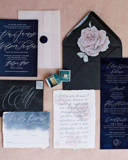 ถ้าบ่าวสาวคิดว่าการ์ดแต่งงานสีน้ำเงินสีเดียวจะดูเรียบเกินไปหรือเปล่า แพรวเวดดิ้งขอแนะนำให้เพิ่มเกล็ดดาวประกายเข้าไปอีกนิดที่ให้ความรู้สึกเหมือนอยู่ใต้หมู่ดาว โดยเลือกใช้เป็นสีทองเพื่อให้ดูหรูหราขึ้น ซึ่งสีทองกับสีน้ำเงินบอกเลยว่าเข้ากันเว่อร์