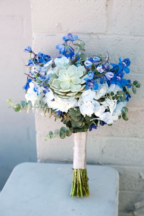 อีกหนึ่งไอเดียเล็กๆ แต่น่ารักอย่างช่อดอกไม้เจ้าสาวสีน้ำเงินสดใสที่ถึงแม้จะมีสีเข้มโดดเด่นแต่รับรองว่าไม่แย่งซีนเจ้าสาวหรือชุดแต่งงานแน่นอน หรือแม้กระทั่งดอกไม้ติดหน้าอกสำหรับเจ้าบ่าว หรือผู้ใหญ่ก็ดูดีไม่แพ้กัน ที่สำคัญขอแนะนำให้เลือกใช้เป็นดอกไม้จริงดีกว่าดอกไม้ย้อมสีนะคะ เพื่อความเรียลและความสวยงามค่ะ ซึ่งดอกไม้ในเฉดสีน้ำเงินไปจนถึงสีฟ้าก็มีให้เลือกมากมาย ไม้ว่าจะเป็น ดอกฟอร์เก็ตมีน็อต, ดอกไฮเดรนเยีย หรือดอกป๊อปปี้สีฟ้า เป็นต้น ซึ่งนอกจากจะเป็นดอกไม้สำหรับเจ้าบ่าวเจ้าสาวแล้ว ยังสามารถนำมาตกแต่งเป็นเซ็นเตอร์พีชสวยๆ ได้อีกด้วย