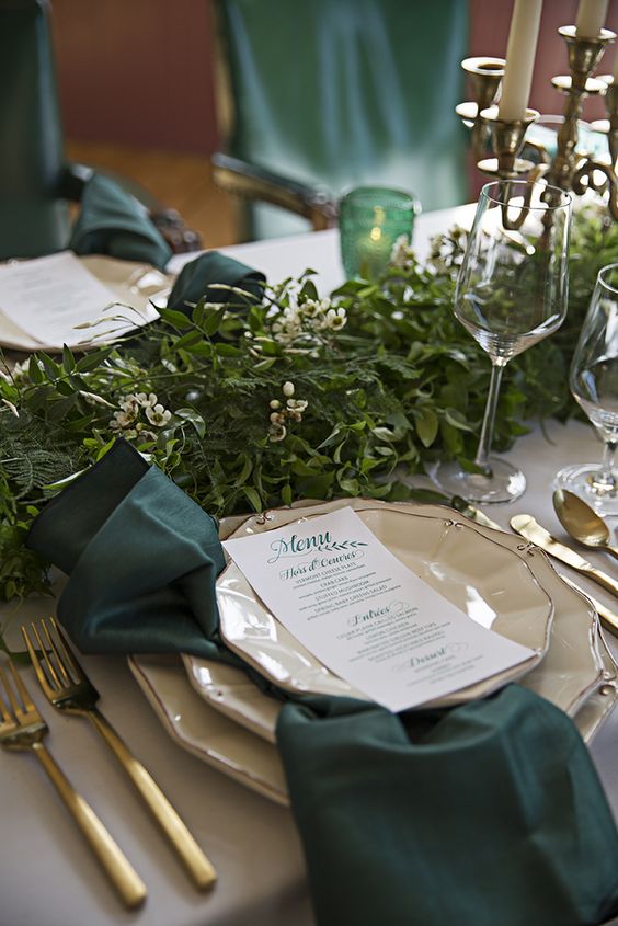 การตกแต่ง หลายคนอาจจะนึกไปถึงธีมรัสติคที่เน้นความเขียวแบบบ้านไร่ท่ามกลางงานเอาท์ดอร์ แต่เปล่าเลย นี่คืองานในร่มที่ตกแต่งด้วยโทนสีเขียวแบบไม่มีดอกไม้มาเจือปน แต่ต้องไม่ลืมว่าต้องเป็นโทนสีเขียวเข้มเท่านั้นนะ