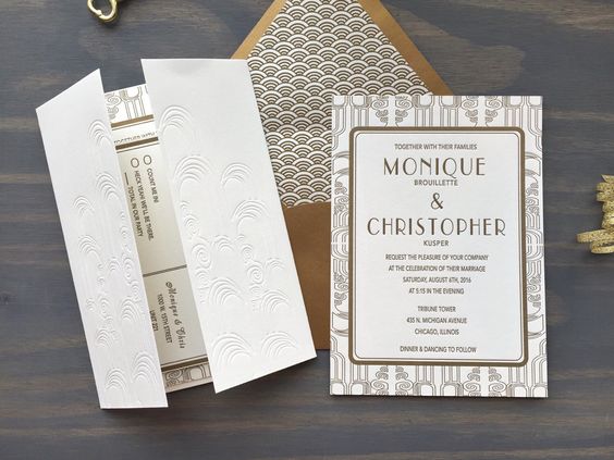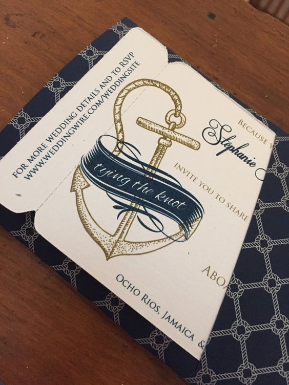 การ์ดเชิญเน้นที่โทนสีน้ำเงิน ขาว แล้วแต่งแต้มด้วยสีทอง อาจเพิ่มกระดาษฉลุเลียนแบบลูกไม้ ที่ยุคนั้นนิยมนำมาประดับเสื้อผ้าเพื่อเพิ่มความอ่อนหวาน หรือจะเลียนแบบตั๋วเรือมาก็สวยแปลกตาน่าสะสมทีเดียว
