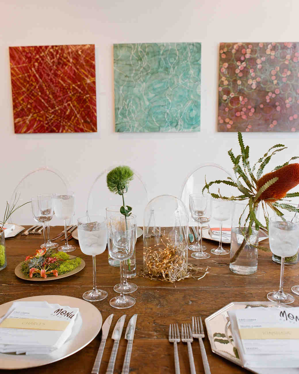 แจกันแบบจีนเน้นสีขาวน้ำเงินประหนึ่งเครื่องลายคราม จับคู่กับดอกไม้สีสันสดใส ตั้งวางไว้เป็นกลุ่มไล่ระดับที่กลางโต๊ะอาหาร