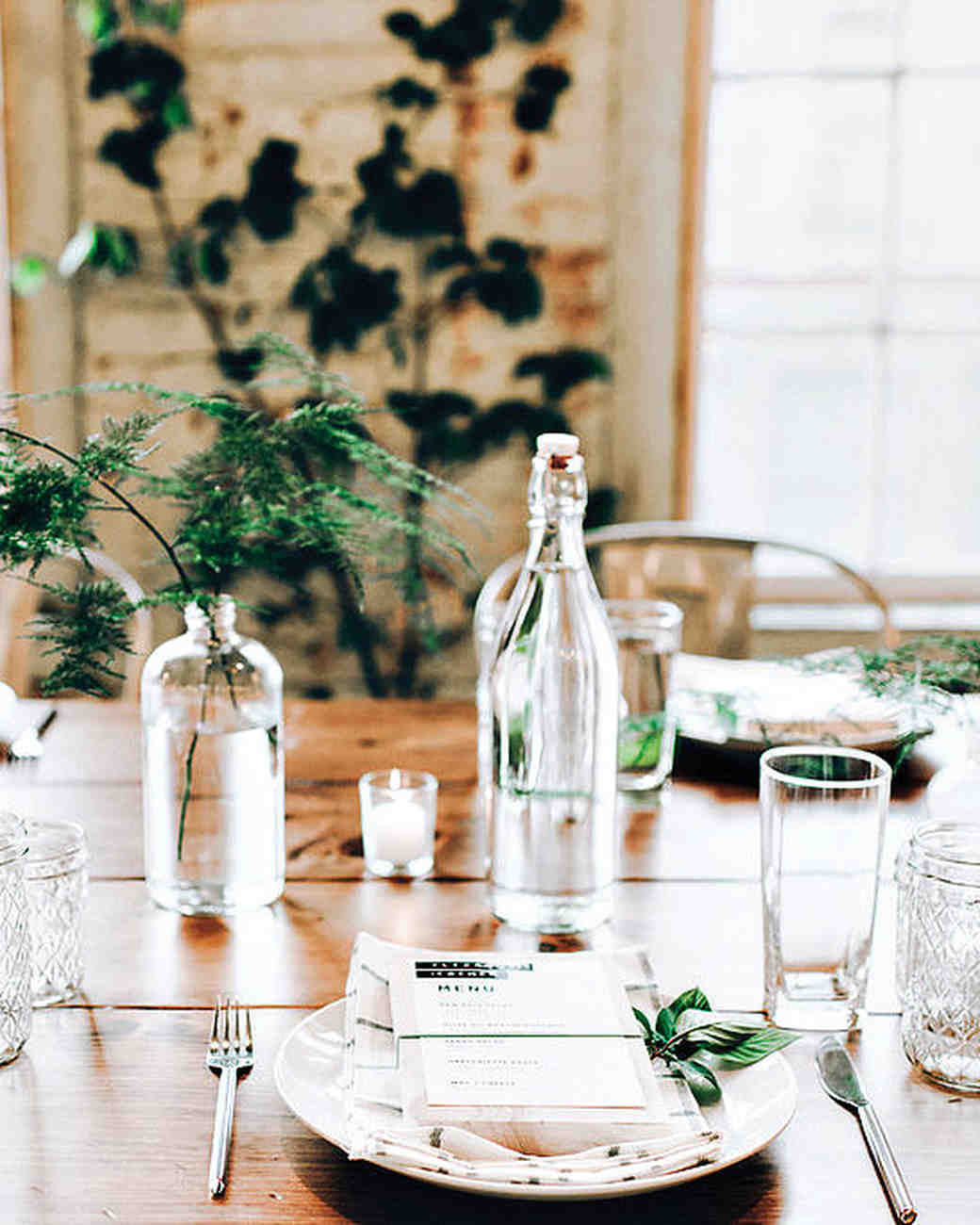 ขวดแก้วสไตล์วินเทจกับคู่กับดอกไม้แบบ 1 ขวด ต่อ 1 ชนิด เทคนิกคือวางกระจายตัวกันไว้กลางโต๊ะอาหาร