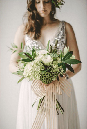 ช่อดอกไม้เจ้าสาวในธีมธรรมชาติสีเขียวน้ำตาลแบบนี้ มักไม่เน้นงานดอกไม้ แต่จะให้ความสำคัญกับใบไม้สีเขียว ไม้ตระกูลแคดตัส หรือฝักบัวเขียวนวล แล้วแซมด้วยกิ่งไม้สีน้ำตาล