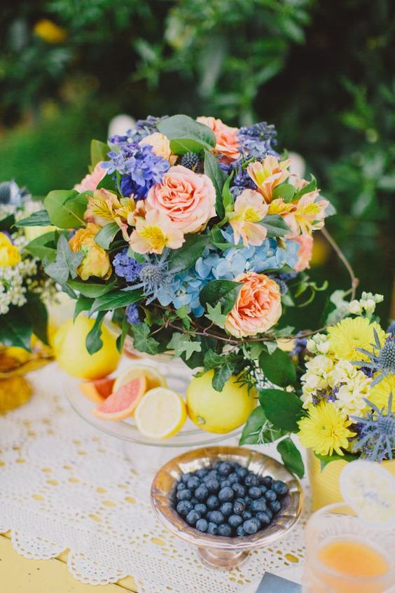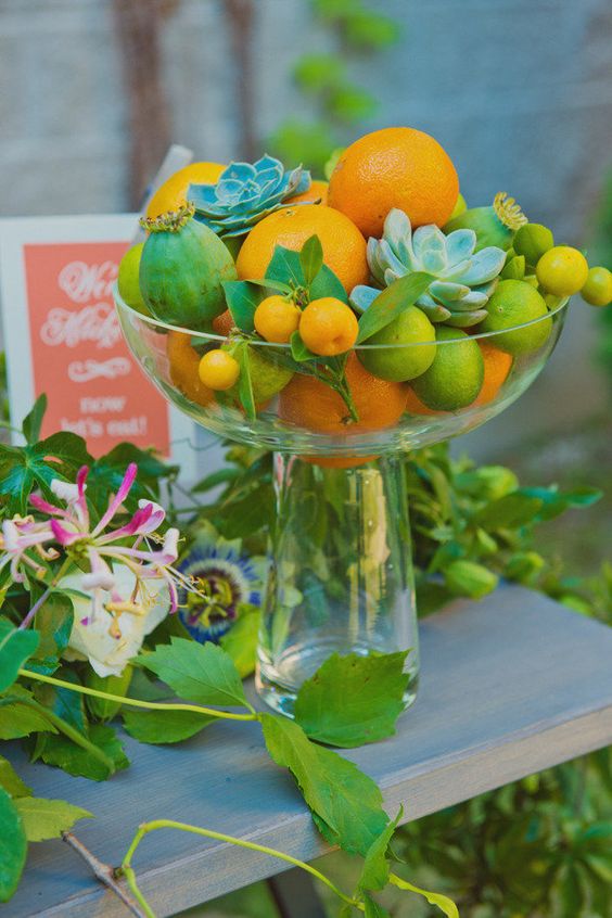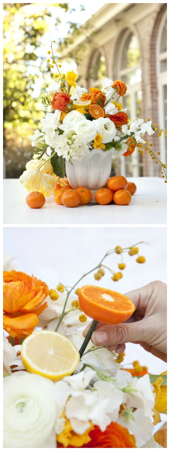 ลองเปลี่ยนแจกันดอกไม้ธรรมดา มาเป็นแจกันผลไม้ตระกูลซิตรัสดูสิ ไม่ว่าจะเป็นส้ม เลมอน มะนาว ก็สมารถเอามาตกแต่งเป็นแจกันดอกไม้ได้ แซมด้วยใบไม้สีเขียวและตกแต่งด้วยดอกไม้เฉดสีต่างๆ มองแล้วสบายตาและสดชื่นขึ้นมาทันที