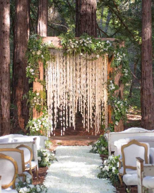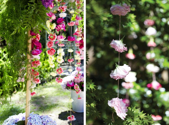 เพิ่มความอ่อนหวาน ตรงปรัมพิธี ใช้ดอกไม้มาทำเป็นม่านตกแต่งตรงซุ้มพิธี ก็ทำให้ดูอ่อนหวาน แต่แอบหรูเล็กๆ ด้วยนะ