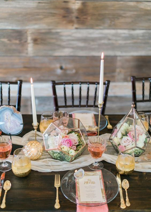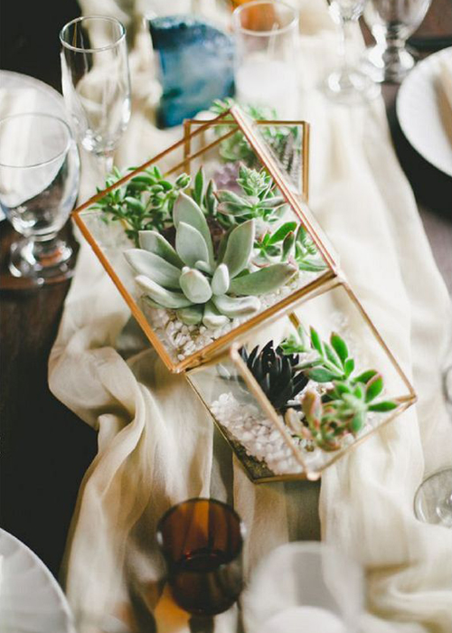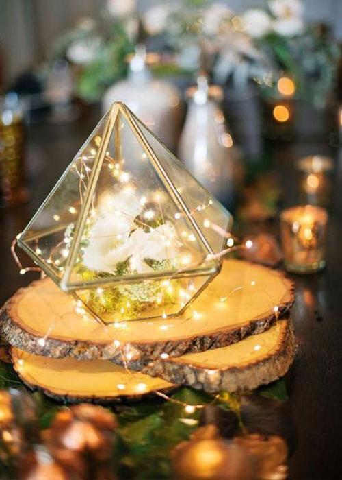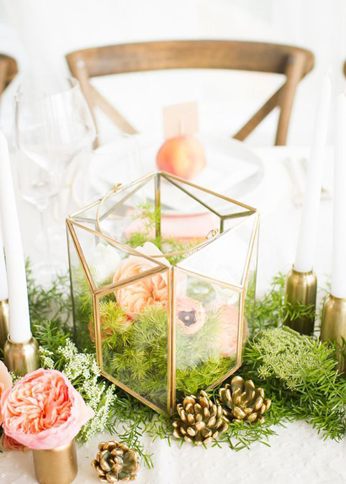 ทริคอยู่ที่การเลือกขวดโหลสำหรับบรรจุสวนจิ๋วที่ไม่ได้มีแค่รูปร่างห้าเหลี่ยม ทรงกลมหรือรูปหยดน้ำ แต่บางแบบจะเป็นขวดโหลที่มีส่วนผสมของวัสดุอื่นๆ เช่นทองแดง ไม้ เงิน ฯลฯ ที่คุณสามารถเลือกสีวัสดุให้เข้ากับสีธีมงานของคุณ จากนั้นกำหนดชนิดต้นไม้และดอกไม้ที่จะจัดแต่งเป็นสวนของคุณลงไป แล้วนำไปจัดวางเป็นเซ็นเตอร์พีช ความดีงามอีกอย่างที่ใช้สวนในขวดแก้วมาเป็นเซ็นเตอร์พีชคือความหลากหลาย เพราะแต่ละขวดโหลนั้นนอกจากรูปทรงจะต่างกันแล้ว ชนิดของต้นไม้ยังสามารถจัดวางให้ต่าง ทำให้สวนขวดของคุณไม่มีชิ้นไหนเหมือนกันเลย