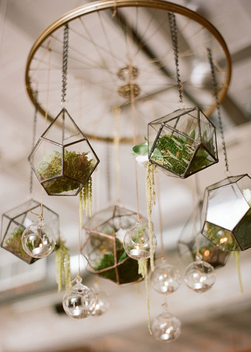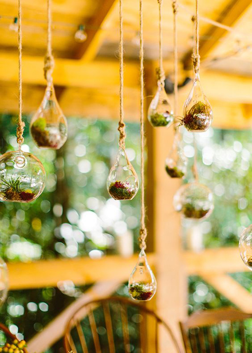 อย่างที่บอกไปแล้วว่าขวดแก้วที่นำมาจัดสวนนี้มีรูปทรงมากมาย หากคุณอยากนำมาห้อยไล่ระดับบนเพดานในงานแต่งงานละก็ แค่เลือกโหลแบบที่เป็นทรงหยุดน้ำ ทรงกลม หรือแบบไหนก็ได้ที่มีห่วงติดมาที่ด้านบน จากนั้นนำเส้นเอ็นหรือลวดสลิงมาผูก เมื่อจัดสวนจิ๋วเข้าไปแล้วก็นำขึ้นไปห้อยไว้ แค่นี้ก็ได้สวนในขวดแก้วที่ลอยละล่องบนอากาศแล้วค่ะ