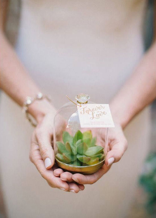 แทนคำขอบคุณแขกในงานด้วยการออเดอร์สวนจิ๋วให้กับแขกในงานเป็นที่ระลึก จะใส่กิมมิคเก๋ๆ ด้วยการผูกป้ายชื่อแขกแต่ละคนไปกับขวดแก้วแต่ละขวดหรือห้อยป้าย Thank You ติดลงไปก็แทนคำพูดขอบคุณจากใจบ่าวสาวได้ไม่ต่างกัน