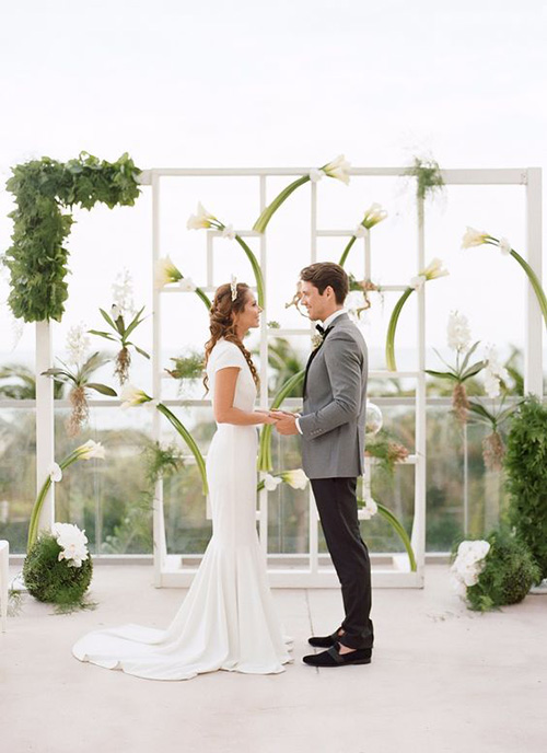 เก๋ๆ มีสไตล์และมีความโมเดิร์นไม่แพ้ฉากถ่ายภาพแบบไหนต้องยกให้ฉากถ่ายภาพที่เลือกเอารูปทรงเลขาคณิตมาใช้ และตกแต่งด้วยดอกไม้สวยๆ สีสดๆ แบบนี้