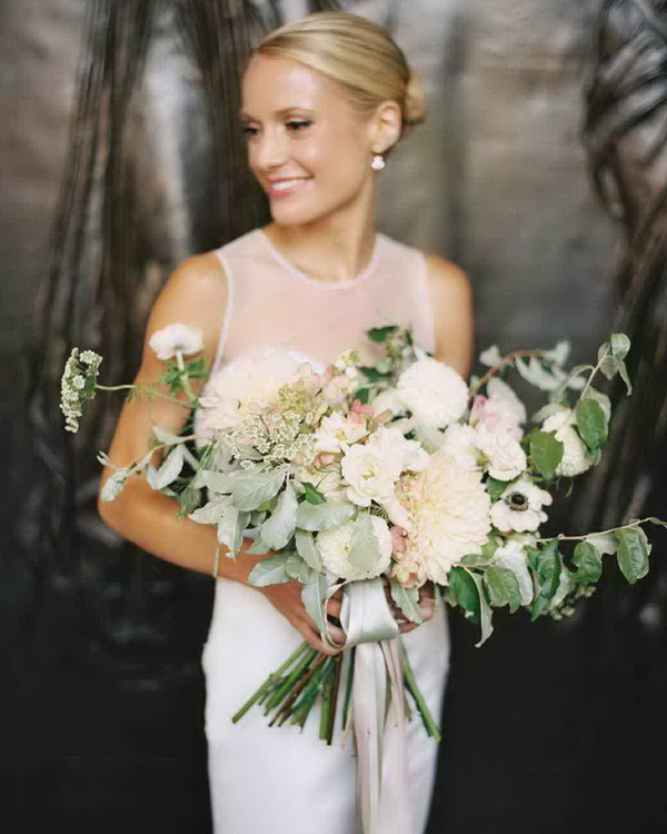 ช่อดอกไม้เจ้าสาวเน้นโทนสีขาวและเขียวจากดอกกุหลาบและดอกรักเร่