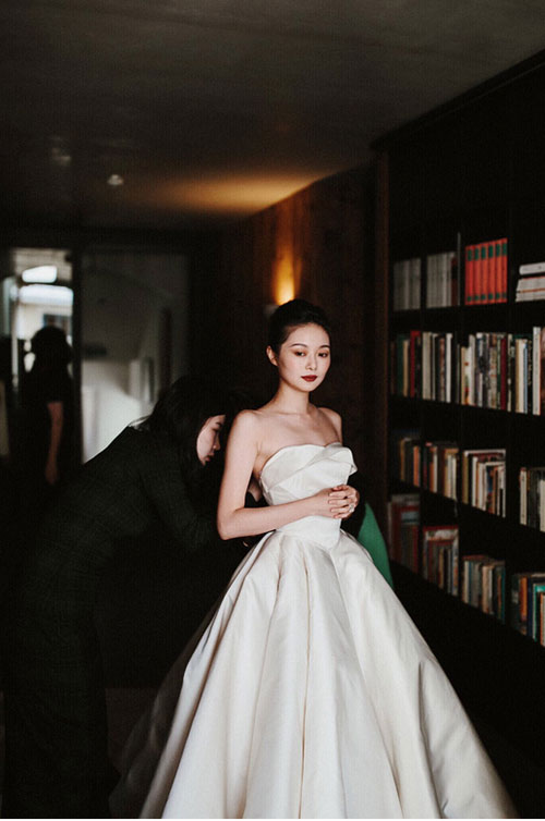 ชุดแต่งงานเกาะอกสุดคลาสสิคทรงบอลกาว์นจาก Masha Ma ดีไซน์เนอร์ชื่อดังแห่งเมืองเซี่ยงไฮ้ ที่ออกแบบเป็นพิเศษเพื่อ Wanwan โดยเฉพาะ