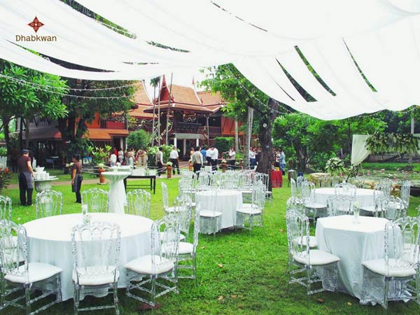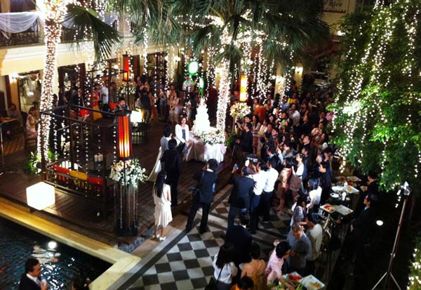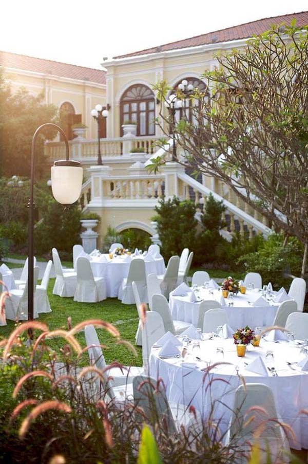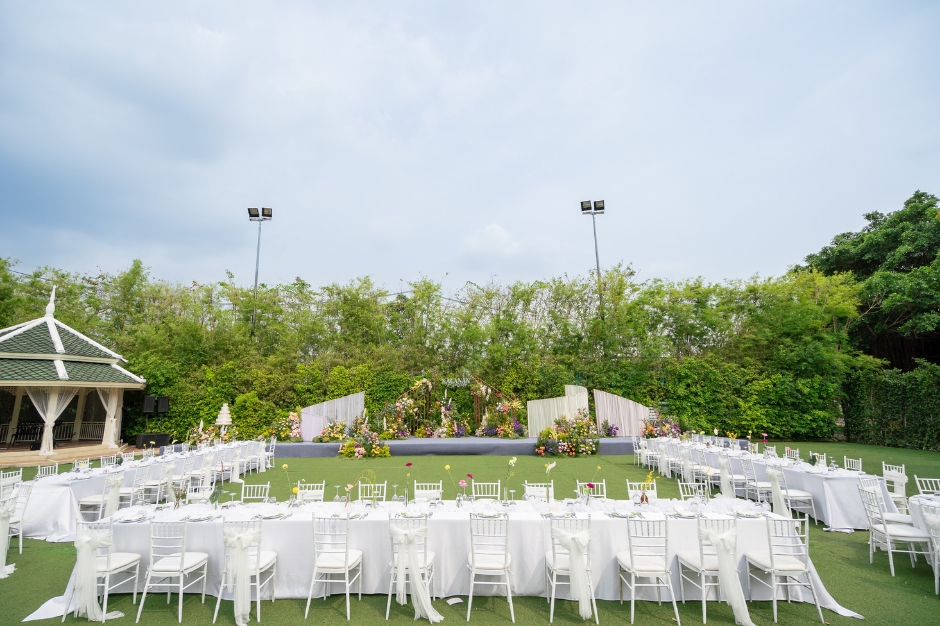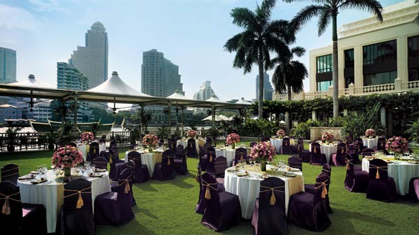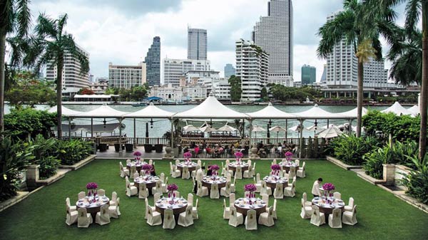 โรงแรมหรู 5 ดาว ริมแม่น้ำเจ้าพระยา บรรยากาศในสวน The Lawn บอกเลยว่าดีเยี่ยม กับงานกลางสนามหญ้าขนาดใหญ่ ที่พื้นเรียบจนสามารถแดนซ์และสโลว์ซบสุดโรแมนติคภายใต้หมู่ดาวได้ แถมยังเห็นวิวแม่น้ำเจ้าพระยาได้ตลอดทั้งสวน และที่สำคัญคือสวนมีขนาดใหญ่มากชนิดรองรับคนได้มากถึง 300 คน