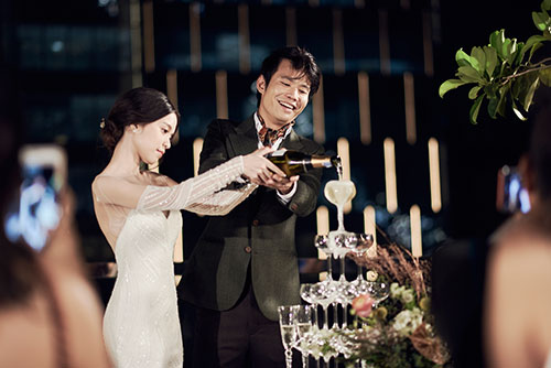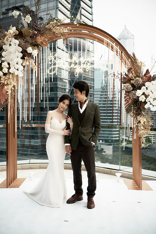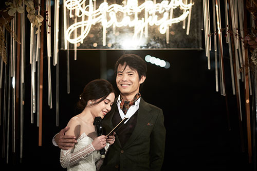 ซึ่งงานแต่งงานของทั้งคู่จัดขึ้นในธีม Shade of Eden ซึ่งนอกจากจะเป็นธีมงานแต่งแล้ว บ่าวสาวยังใช้เป็นธีมเดรสโค้ดด้วย โดยให้แขกที่มาร่วมงานตีความคำว่า Eden ในสไตล์ของตัวเอง ส่วน Eden ในความหมายของบ่าวสาวก็คือ สถานที่จัดงานแต่งงาน ที่ทั้งคู่บอกว่าไม่อยากจัดงานในห้องบอลรูมแต่อยากได้สถานที่ที่มีบรรยากาศเหมือนได้ชวนทุกคนมาปาร์ตี้ที่บ้าน โดยบ่าวสาวแบ่งพื้นที่การจัดงานออกเป็น 2 ส่วนคือ พื้นที่ด้านในบรรยากาศสบายเหมือนบ้านสำหรับแขกผู้ใหญ่ และโซนด้านนอกแบบเอ้าท์ดอร์ให้เพื่อนๆ ได้ปาร์ตี้