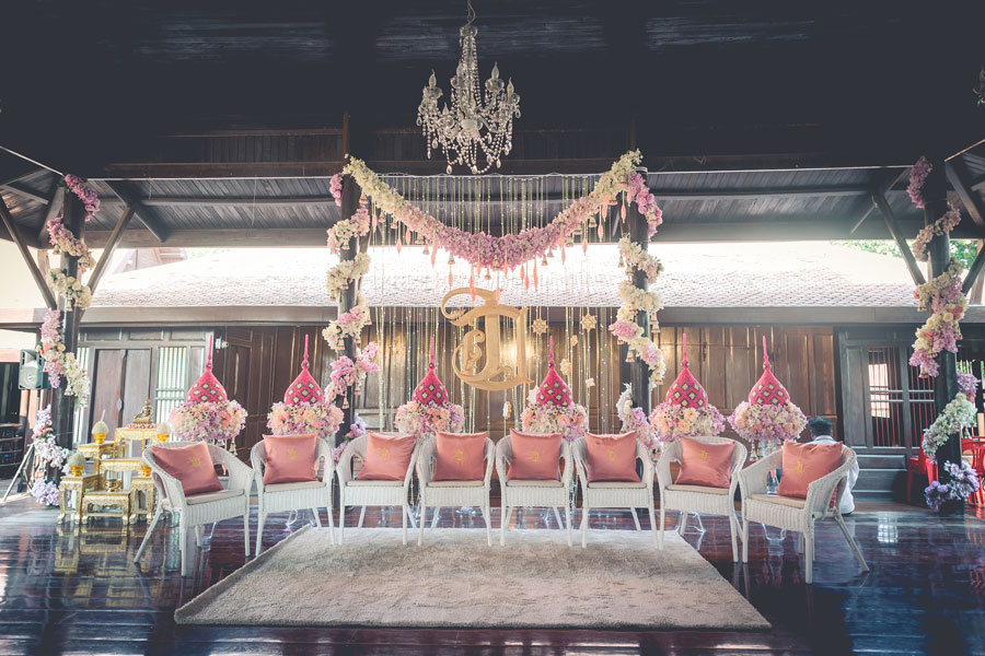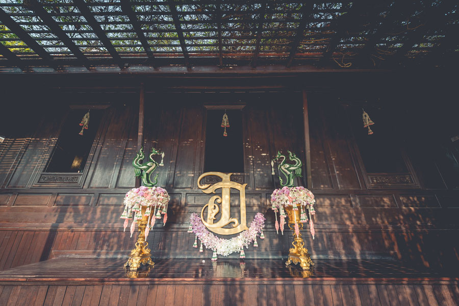 ด้านการตกแต่งจากทางเข้าจนถึงเรือนไทยเรียงรายไปด้วยต้นไม้สีขาว โดดเด่นด้วยร่มเชียงใหม่คันใหญ่ที่กางไว้ทั่วงาน บนเรือนไทยตกแต่งด้วยดอกไม้สดทั่วบริเวณ มีจุดเด่นอยู่ที่การ์แลนด์ดอกไม้สีชมพูหวานที่เลื้อยเลาะตามเสาไม้แทรกด้วยงานอุบะ พานพุ่ม และมู่ลี่ระย้าดอกไม้ไทยสุดวิจิตร นอกจากนี้เสริมกิมมิกอย่างการแจกร่มคันเล็กสีสดใสให้แขกที่มาร่วมงานได้ใช้เพื่อป้องกันแสงแดดอันร้อนแรงในช่วงฤดูร้อน และเลือกแจกของชำร่วยเป็นพัดรูปหัวใจสีขาว-ชมพูซึ่งเป็นสีของธีมงาน ซึ่งของทั้งสองอย่างก็ช่วยคลายร้อนให้กับการจัดงานในช่วงเดือนเมษายนได้เป็นอย่างดี