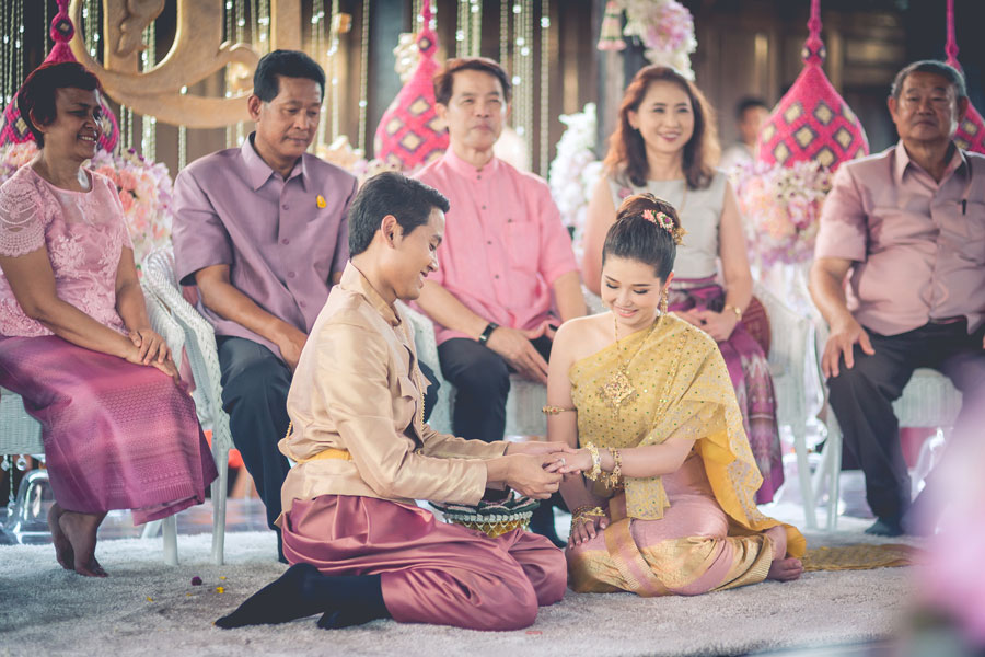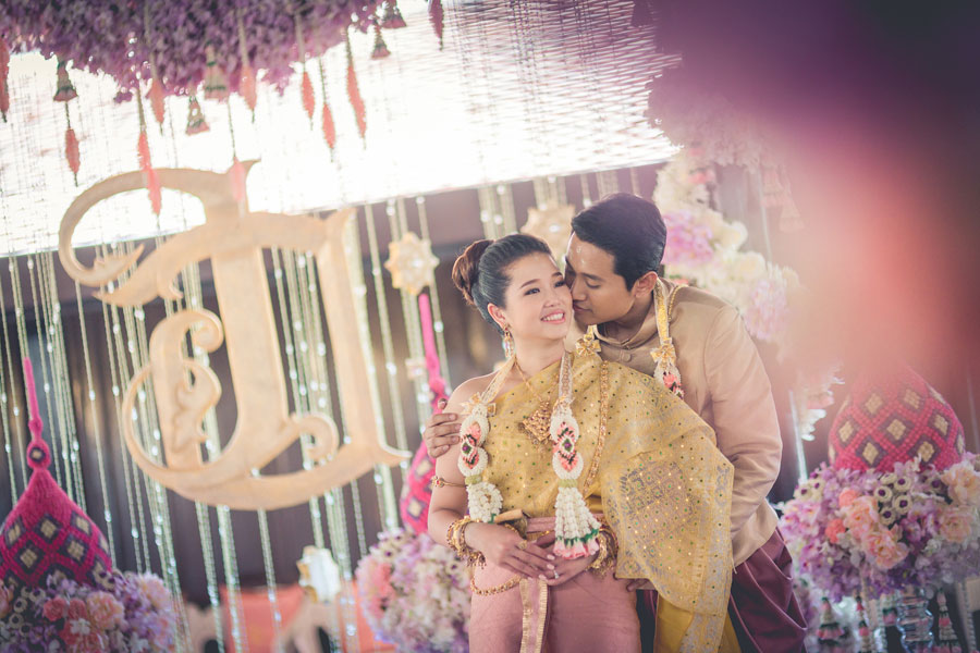 ส่วนพิธีการแต่งงานก็ยังคงตามแบบไทยเดิม เริ่มจากพิธีเลี้ยงพระในตอนเช้าเพื่อความเป็นสิริมงคล แล้วต่อด้วยการแห่ขันหมากที่รูปขบวนเต็มไปด้วยความสวยงามของผ้าไทย จากนั้นจึงเป็นพิธีสู่ขอ พิธีสวมแหวน รับไหว้ผู้ใหญ่ และพิธีหลั่งน้ำพระพุทธมนต์ ซึ่งหลังเสร็จสิ้นพิธีก็มีการแสดงมหรสพถึง 6 ชุด ได้แก่ รจนาเสี่ยงพวงมาลัย ระบำนางกอย ระบำเทพบันเทิง ระบำวิชนี ระบำสุโขทัย และการแสดงโขนชุด รามเกียรติ์ ตอนหนุมานจับนางสุพรรณมัจฉา ถือได้ว่าเป็นการจบพิธีแต่งงานไทยแบบโบราณได้อย่างสมบูรณ์แบบจริงๆ