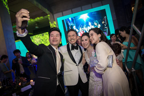 บรรยากาศของงานตกแต่งด้วยแสง เสียง และภาพอันสวยงามสุดอลังการ พร้อมมินิคอนเสิร์ตสุดเอ็กซ์คลูซีฟจาก โต๋-ศักดิ์สิทธิ์ เวชสุภาพร ที่มาสร้างสีสันอย่างใกล้ชิดให้กับแขกที่มาร่วมงานให้ได้กรี๊ดกันอย่างสุดเสียง นอกจากสถานที่จะเจ๋งแล้ว งานนี้บ่าวสาวยังมีไฮไลต์เด็ดในช่วงอาฟเตอร์ปาร์ตี้ที่จัดเต็มทั้งแสงเสียง เหมือนยกคอนเสิร์ตขนาดย่อมมาให้แขกได้มันกันสุดเหวี่ยงจากการแสดงของวงดนตรี YENTED (เย็นเต็ด) และ 60 Miles เรียกได้ว่าเอาใจแขกสายตี๊ดกันเต็มที่