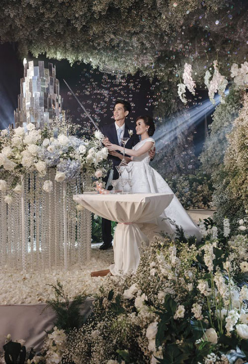 บรรยากาศภายในงานเต็มไปด้วยดอกไม้นานาพรรณที่บ่าว – สาวสั่งปลูกขึ้นใหม่เพื่องานนี้โดยเฉพาะ มีทั้งดอกพีค็อกจากเทือกเขาสะเมิง อำเภอแม่ริม จังหวัดเชียงใหม่ และยังมีดอกไม้นำเข้าอีกกว่า 30 ชนิดที่นำมาใช้ในการตกแต่ง บรรยากาศของงานจึงเหมือนกับสวนเอเดนที่สวยงามราวกับสวรรค์ที่อบอวลไปด้วยความรักของบ่าว – สาวและครอบครัว