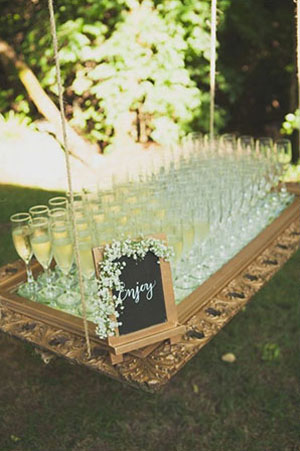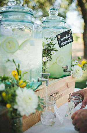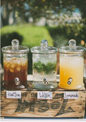 งานแต่งในสวนก็ควรเลือกอาหารและเครื่องดื่มที่มีกลิ่นอายของธรรมชาติ และออร์แกนิค อย่างน้ำอินฟิวส์ที่ผสมน้ำแร่และผลไม้สดเข้าด้วย ส่วนวิธีการเสิร์ฟก็ไม่มีอะไรที่ชิคไปกว่าการใส่ในคูลเลอร์แก้วขนาดใหญ่ ที่มีก๊อกอันน้อยให้คอยเปิดปิดน้ำใส่แก้ว