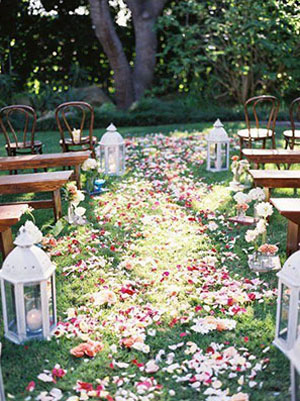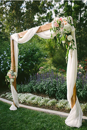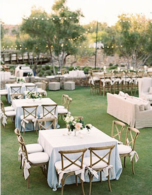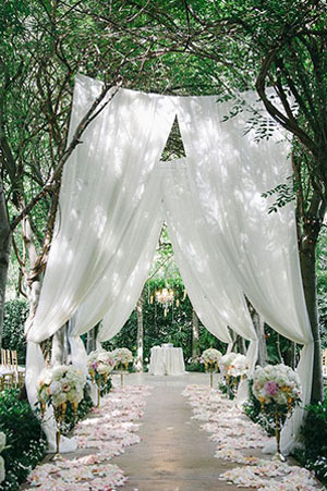 หน้างานและทางเข้างาน ก็ต้องละลานตาด้วยไม้ดอก ไม้ประดับ และเฟอร์นิเจอร์งานไม้ ให้ดีก็เล่นลูกเล่นด้วยผ้าโปร่งสีขาวจับคู่กับดอกไม้สีอ่อน เป็นการจัดงานที่เน้นความอ่อนหวาน แล้วห้ามลืมชิงช้าเด็ดขาดไม่อย่างนั้นจะถือว่าพลาดมาก
