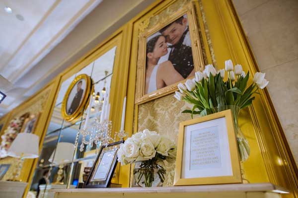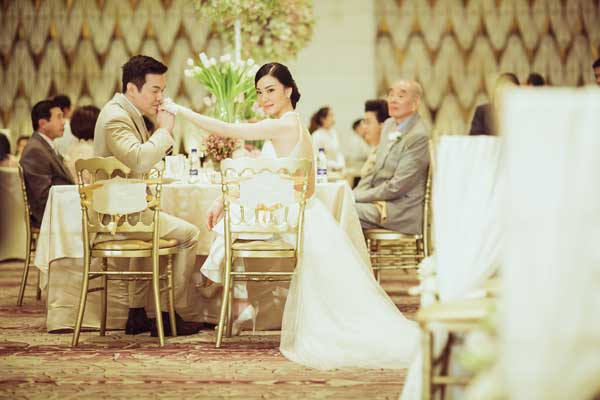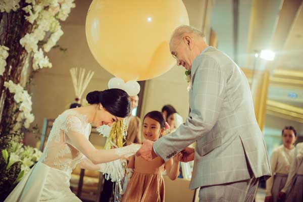 งานฉลองในช่วงเย็นทั้งคู่ยังคงพิถีพิถันกับทุกรายละเอียดแบบไม่มีตกหล่นภายใต้ธีมงานVintage Glamorous ที่ตกแต่งทางเข้าห้องบอลรูมให้เหมือนแขกกำลังเดินเข้าบ้านบ่าว – สาว นอกจากนี้ยังเพิ่มความอบอุ่นด้วยซีเควนซ์สุดประทับใจ เมื่อคุณพ่อและเจ้าสาวควงแขนกันมาเปิดฟลอร์ด้วยเพลงจงรัก ในจังหวะแทงโก้ ก่อนที่เจ้าสาวจะใช้เวลาเพียง10 วินาทีสลัดกระโปรงทิ้งกลายเป็นชุดสำหรับเฟิร์สต์แด๊นซ์สไตล์ Contemporary Dance ในเพลงดินแดนแห่งความรัก จะอบอุ่น หวาน และเรียกเสียงเต้นโครมครามของหัวใจได้มากแค่ไหนขอให้ดูภาพประกอบ แต่ขอบอกเลยว่า แค่เสียงกรีดร้องด้วยความอิจฉาในลำคอคงไม่พอแน่ๆ