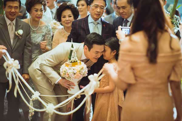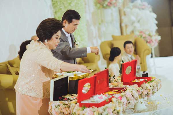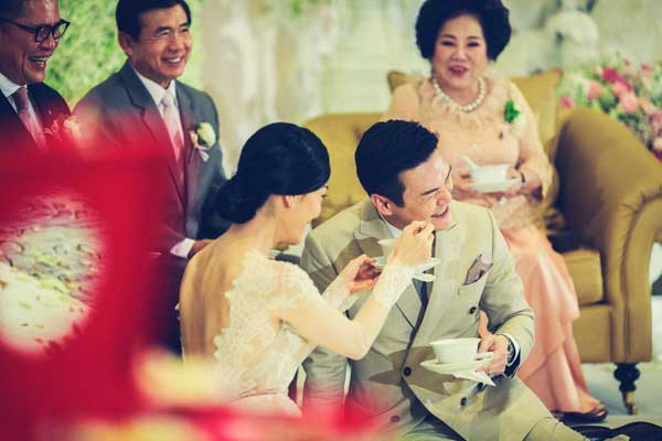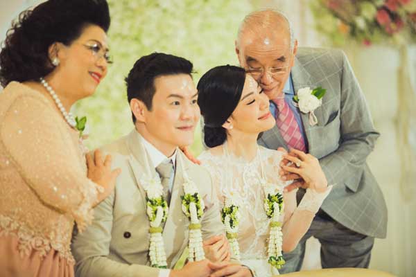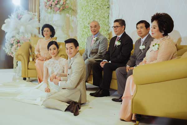 ต่อด้วยการแห่ขันหมาก สวมแหวนหลั่งน้ำพระพุทธมนต์ในชุดเจ้าสาวสไตล์ไทยวินเทจจาก Ananya Couture ที่ใช้ลูกไม้ถึง 5 แบบมาสร้างสรรค์ด้วยฝีมือสุดประณีต ก่อนจะเข้าสู่พิธียกน้ำชาและร่วมกันรับประทานอาหารกลางวันด้วยชุดเจ้าสาวแบบกางเกงสุดคล่องตัวจาก Canitt ดีไซเนอร์คนโปรดอีกคนของเจ้าสาว ท่ามกลางบรรยากาศการตกแต่งสไตล์ French Vintageบนเวทีโดดเด่นด้วยการนำลายลูกไม้บนชุดของเจ้าสาวมาจัดวางลายใหม่และใส่สีชมพูอ่อนๆ ที่เจ้าสาวบอกว่า มองแล้วนึกถึงแก้มใสๆ สีแดงระเรื่ออมชมพูของเด็กสาวที่กำลังแฮ็ปปี้เพราะมีความสุขกับความรักที่อยู่รอบตัว