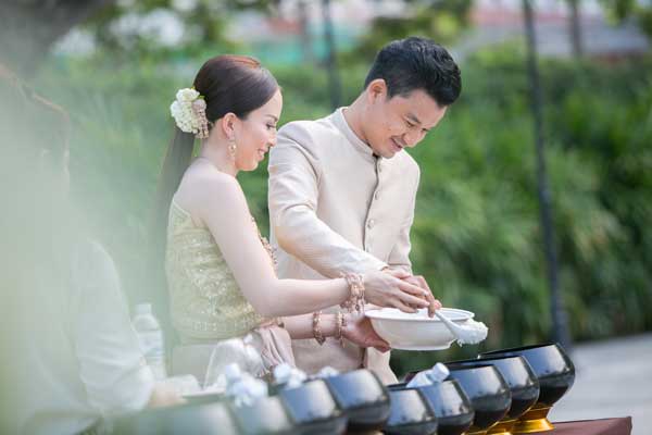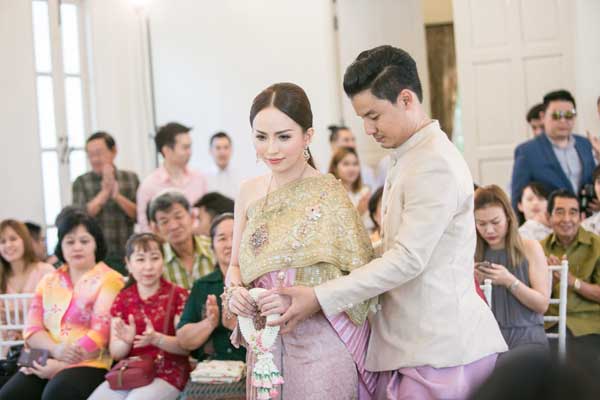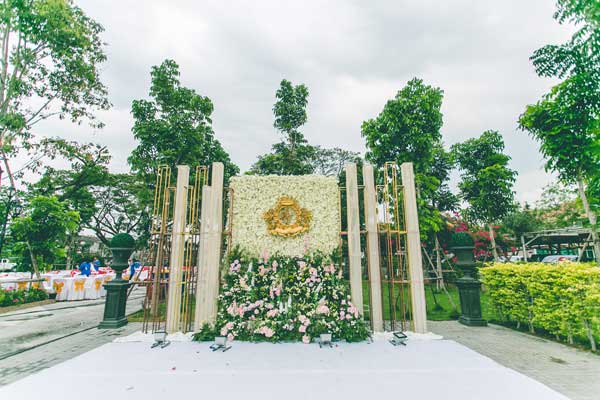 กับโจทย์งานพิธีไทย ที่เจ้าบ่าวและเจ้าสาวต้องการให้ออกมาสวยหวานดูคลาสสิก รับกับความวิจิตรของชุดไทยโทนสีแชมเปญที่ทั้งคู่สวมใส่ ตกแต่งบริเวณงานและบันไดวนทั้งสองฝั่งของตัวอาคารด้วยดอกไม้ไทยผสมฝรั่งโทนขาว-ชมพู แซมใบเขียว ที่ทำให้นึกถึงความโรแมนติกและความเจริญงอกงามของชีวิตคู่ แล้วใส่โครงสร้างจำลองปราสาทและโลโก้สีทองที่รับกันเป็นอย่างดีกับตัวอาคารที่สวยงาม พร้อมประดับด้วยเส้นคริสตัลระยิบระยับ ที่เป็นตัวแทนของความมั่งคั่งบริบูรณ์ เพื่อให้เป็นนิมิตรหมายที่ดีในการเริ่มต้นชีวิตคู่