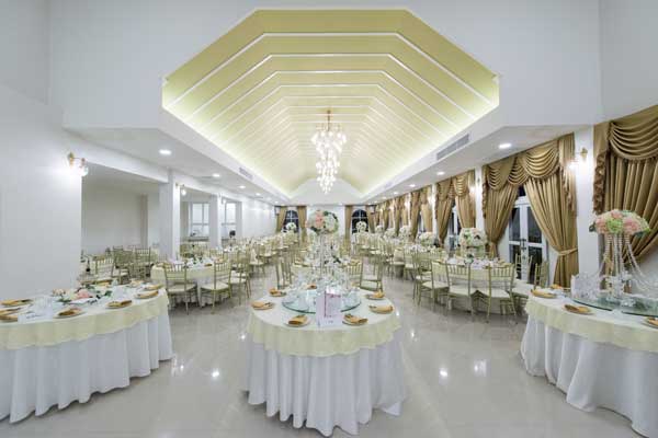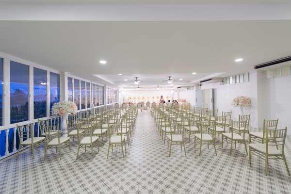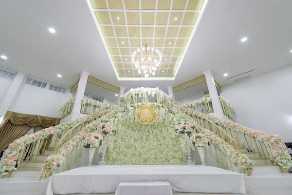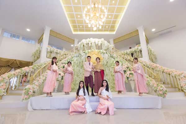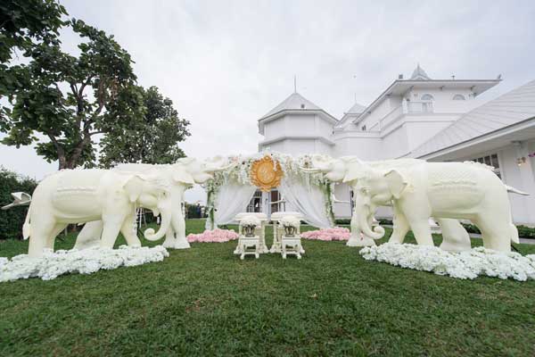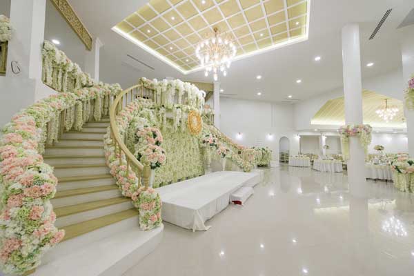 โจทย์ต่อมาคือเรื่องสถานที่และการตกแต่งที่ต้องการให้บรรยากาศโดยรวมของงานแลดูโอ่โถงสบายตาและมีความสดชื่น จึงมาสรุปสถานที่จัดงานกันที่เรือนประกายเพชร เพราะชอบตัวอาคารที่ขาวสะอาดตา และมีห้องทำพิธีกว้างขวางที่ปูพื้นกระเบื้องลายไทย และยังมีสนามหญ้าสวยๆ ที่ปูหญ้าเขียวสดให้ความรู้สึกสดชื่นที่ถือเป็นสัญญาณในการเริ่มต้นชีวิตคู่ได้เป็นอย่างดี แล้วจึงเลือกใส่รายละเอียดตามจุดต่างๆ ด้วยดอกไม้สดสีขาว – เขียว แซมสีส้มพีชอ่อนๆ