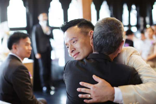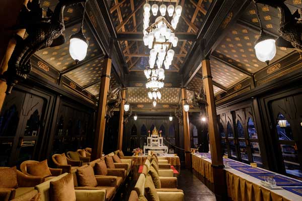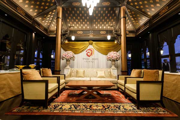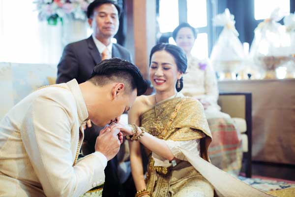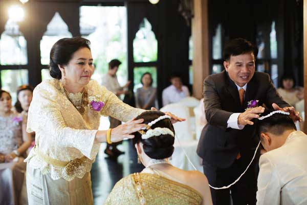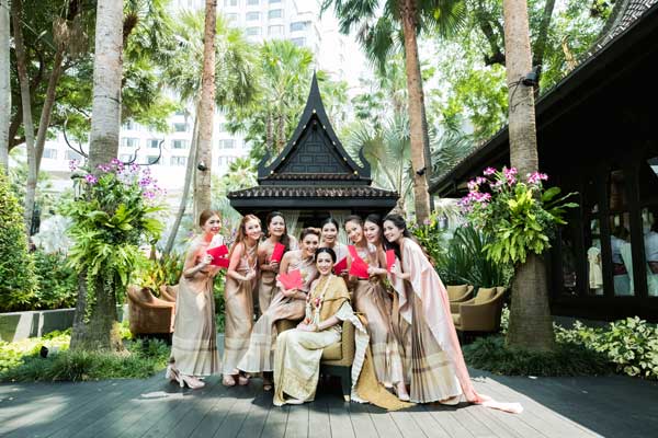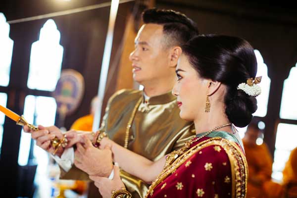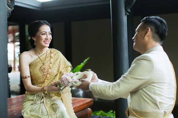 เรื่องแรกที่ทั้งคู่ให้ความสำคัญคือ สถานที่จัดงานแต่งงานที่อยากให้สื่อถึงความเป็นไทย ซึ่งทันทีที่ได้เห็น ศาลาทิพย์ของโรงแรมแชงกรี – ลา กรุงเทพฯ ก็รู้เลยว่าเป็นสถานที่จัดงานแต่งงานที่ตามหา เพราะความที่เป็นเรือนไทยติดริมแม่น้ำเจ้าพระยา จึงให้อารมณ์ย้อนอดีตเสมือนวิถีชีวิตของคนไทยสมัยโบราณที่มักมีบ้านเรือนอยู่ติดริมแม่น้ำ นอกจากนี้เรือนไทยหลังนี้ยังสวยงามอยู่แล้ว จึงไม่ต้องตกแต่งอะไรมาก แค่เสริมดอกไม้สดอีกนิดก็ดูมีชีวิตชีวาพร้อมจะรับแขกที่มาร่วมยินดี