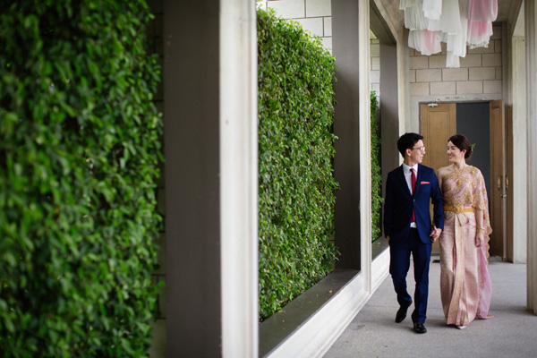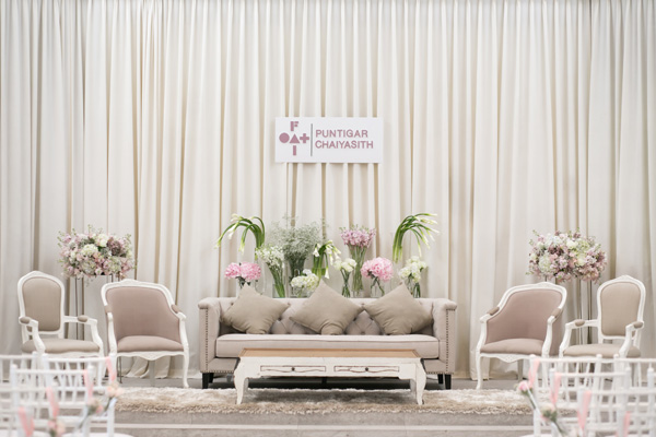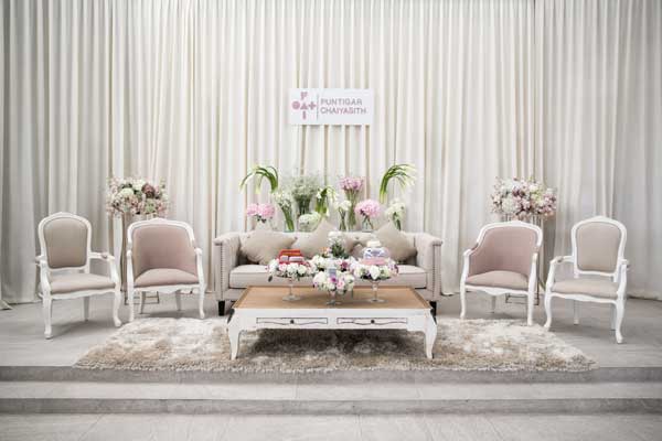 งานเช้าเป็นงานพิธีไทยที่ปล่อยสเปซให้โปร่งและโล่ง ทำให้มู้ดแอนด์โทนของงานโดยรวมออกมาดูเรียบง่าย แต่เน้นความเป็นไทย ใช้ดอกไม้ไม่เยอะนัก เน้นตัวสถานที่เป็นหลัก และใช้แมทีเรียลต่างๆ ที่ผสมผสานกลิ่นอายความเป็นไทยและสากล แล้วจัดวางให้ลงตัวอย่างที่ทั้งคู่ตั้งใจไว้ ซึ่งจะเรียกว่าเป็นการฝากลายเซ็นของตัวเองไว้ก็ไม่ผิดนัก